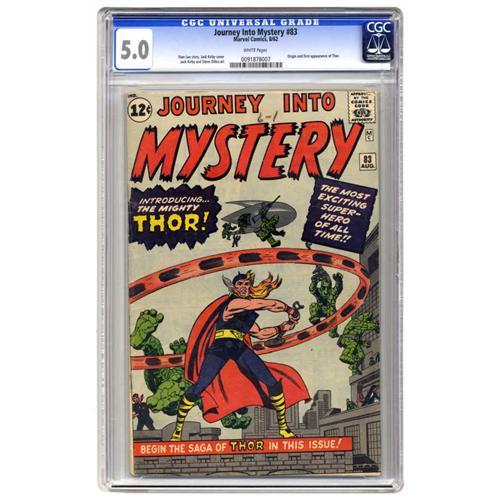 <B>Journey Into Mystery #83 (Marvel, 1962) CGC VG/FN 5.0 White pages.</B></I> This issue, the origin and first appearance of Thor, continued Marvel's string of hits after the Fantastic Four and the Incredible Hulk had burst onto the comics scene. The Thunder God was a classic Mr. Meek-becomes-scintillating-superhero tale by Stan Lee and Jack Kirby, and the "King" would stay with the character for more than 100 issues, a total that sticks out like a Thor sum. By the way, there are also two "mystery" backup features with art by Steve Ditko and Don Heck. Overstreet 2005 VG 4.0 value = $910; FN 6.0 value = $1,365. CGC census 12/05: 30 in 5.0, 104 higher.