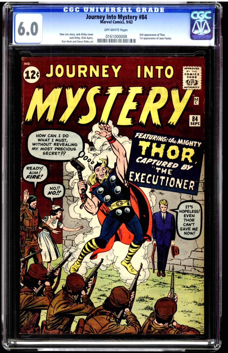 Journey Into Mystery #84 CGC 6.0 off-white pages. Stan Lee story, Jack Kirby cover. Jack Kirby, Dick Ayers, Don Heck and Steve Ditko art. 2nd appearance of Thor, 1st appearance of Jane Foster.The CGC universal census reports 13 at 6.0 and 79 higher.