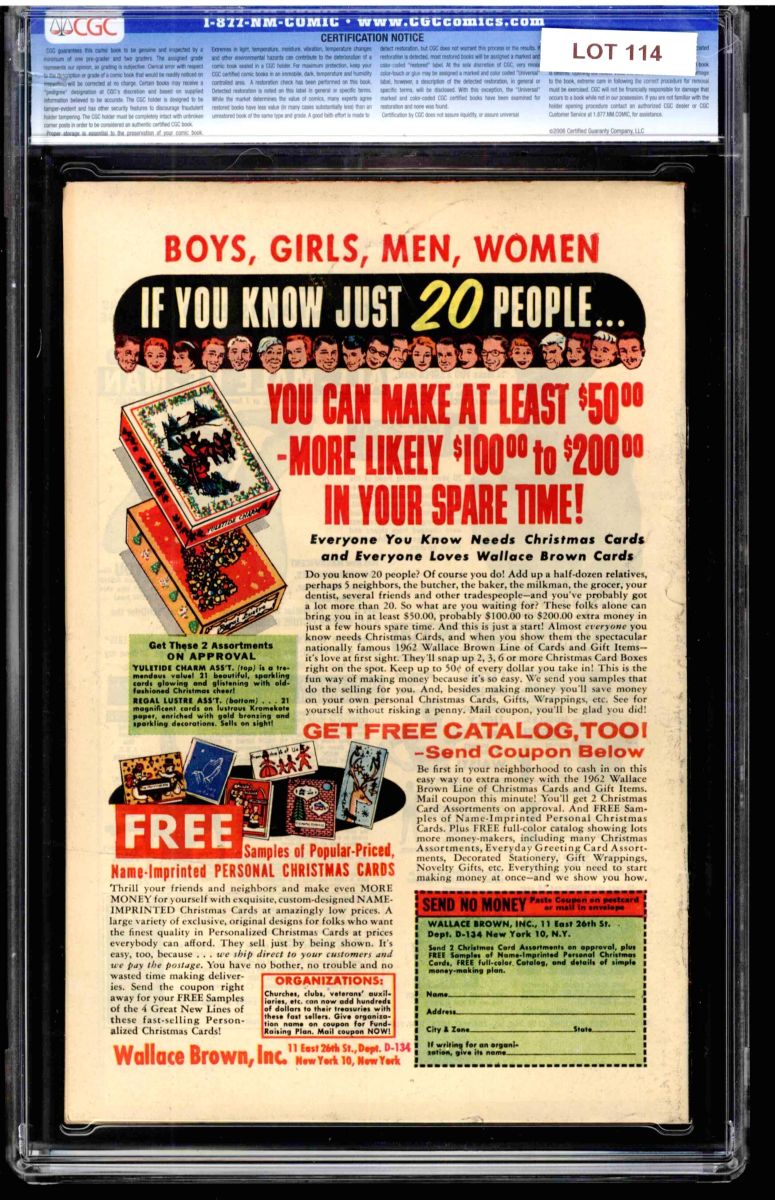 The Auctioneer has reserved the right to reject any and all bids, and to bid at the auction. Auctioneers Auctions are not on approval. Auctioneer does not allow certified material to be returned because of possible differences of opinion with respect to the grade offered by any third party organization, dealer, or service. Absolutely no guarantee of grade is offered for un-certified property sold and subsequently submitted to a third-party grading service. There will be no exceptions to this policy. Under extremely limited circumstances, (e.g. gross cataloging error) a purchaser, who did not bid from the floor, may request Auctioneer to evaluate voiding a sale; such request must be made in writing detailing the alleged gross error, and submission of the lot to the Auctioneer must be pre-approved by the Auctioneer. Bidder must notify Auctioneer in writing of such request within three (3) days of the non-floor bidder receipt of the lot. Any lot that is to be evaluated must be in our offices within 30 days after Auction. Grading does not qualify for this evaluation process nor do such complaints constitute a basis to challenge the authenticity of a lot. AFTER THAT 30-DAY PERIOD, NO LOTS MAY BE RETURNED FOR REASONS OTHER THAN AUTHENTICITY. Lots returned must be housed intact in the original holder. No lots purchased by floor Bidders may be returned (including those Bidders acting as agents for others). Late remittance for purchases may be considered just cause to revoke all return privileges. B: Auctions conducted solely on the Internet have a THREE (3) DAY RETURN POLICY: Lots paid for within seven days of the Auction closing are sold with a three (3) day return privilege. You may return lots under the following conditions: Within three days of receipt of the lot, you must first notify Auctioneer by contacting Client Service by phone (314-680-8599) or e-mail (moundcityauctions@gmail.com), and immediately mail the lot(s) fully insured to the attention of Returns, Mound City Auctions 1081 Teson Rd. Hazelwood, MO. 63042. Lots must be housed intact in their original holder and in their original condition. You are responsible for the insured, safe delivery of any lots. Auctioneer will not be responsible for lots returned in non-registered mail or lots returned without prior authorization per section B. A non-negotiable return fee of 5% of the purchase price ($10 per lot minimum) will be deducted from the refund for each returned lot or billed directly. Postage and handling fees are not refunded. After the three-day period (from receipt), no items may be returned for any reason. Late remittance for purchases revokes all Return-Restock privileges. C: Bidders who have inspected the lots prior to the auction will not be granted any return privileges. D: Comic books sold referencing a third-party grading service are sold “as is” without any express or implied warranty. Certain warranties may be available from the grading services and the Bidder is referred to them for further details: Certified Guaranty Company, LLC. (CGC), P.O. Box 4738, Sarasota, FL 34230. E: Bidders who intend to challenge authenticity or provenance of a lot must notify Auctioneer in writing within thirty (30) days of the Auctions conclusion. In the event Auctioneer cannot deliver the lot or subsequently it is established that the lot lacks title, provenance, authenticity, or other transfer or condition issue is claimed, Auctioneer's liability shall be limited to rescission of sale and refund of purchase price; in no case shall Auctioneer's maximum liability exceed the high bid on that lot, which bid shall be deemed for all purposes the value of the lot. After one year has elapsed, Auctioneer's maximum liability shall be limited to any commissions and fees Auctioneer earned on that lot. F: All comics are guaranteed genuine, but are not guaranteed as to grade, since grading is a matter of opinion, an art and not a science, and therefore the opinion rendered by the Auctioneer or any third party grading service may not agree with the opinion of others (including trained experts), and the same expert may not grade the same item with the same grade at two different times. G: Since we cannot examine encapsulated comics, they are sold “as is”without our grading opinion, and may not be returned for any reason. Auctioneer shall not be liable for any patent or latent defect or controversy pertaining to or arising from any encapsulated collectible. In any such instance, purchaser's remedy, if any, shall be solely against the service certifying the collectible. H: Due to changing grading standards over time, differing interpretations, and to possible mishandling of items by subsequent owners, Auctioneer reserves the right to grade items differently than shown on certificates from any grading service that accompany the items. Auctioneer also reserves the right to grade items differently than the grades shown in the prior catalog should such items be reconsigned to any future auction. I: Although consensus grading is employed by most grading services, it should be noted as aforesaid that grading is not an exact science. In fact, it is entirely possible that if a lot is broken out of a plastic holder and resubmitted to another grading service or even to the same service, the lot could come back with a different grade assigned. J: Certification does not guarantee protection against the normal risks associated with potentially volatile markets. The degree of liquidity for certified collectibles will vary according to general market conditions and the particular lot involved. For some lots there may be no active market at all at certain points in time."