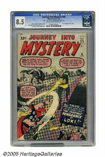 <B>Journey Into Mystery #88 (Marvel, 1963) CGC VF+ 8.5 Cream to off-white pages.</B></I> Loki and Thor engage in battle on the Rainbow Bridge, as Odin observes the action. Jack Kirby and Steve Ditko do the art on this issue. An exceptional copy, exhibiting only light edge wear and no chipping. Overstreet 2005 VF 8.0 value = $352; VF/NM 9.0 value = $551. CGC census 7/05: 6 in 8.5, 15 higher. <I>From the collection of Joe and Nadia Mannarino.</B></I>