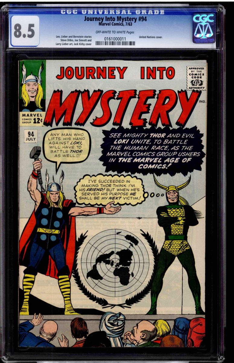 Journey Into Mystery #94 CGC 8.5 off-white to white pages. Lee, Lieber and Bernstein stories. Steve Ditko, Joe Sinnott and Larry Lieber art, Jack Kirby cover. United Nations cover. Overstreet 2009 VF 8.0 value = $255; VF/NM 9.0 value = $465. CGC census: 6 at 8.5, 11 higher.
