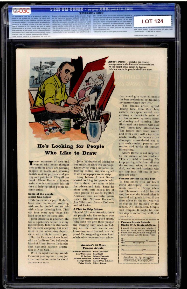 The Auctioneer has reserved the right to reject any and all bids, and to bid at the auction. Auctioneers Auctions are not on approval. Auctioneer does not allow certified material to be returned because of possible differences of opinion with respect to the grade offered by any third party organization, dealer, or service. Absolutely no guarantee of grade is offered for un-certified property sold and subsequently submitted to a third-party grading service. There will be no exceptions to this policy. Under extremely limited circumstances, (e.g. gross cataloging error) a purchaser, who did not bid from the floor, may request Auctioneer to evaluate voiding a sale; such request must be made in writing detailing the alleged gross error, and submission of the lot to the Auctioneer must be pre-approved by the Auctioneer. Bidder must notify Auctioneer in writing of such request within three (3) days of the non-floor bidder receipt of the lot. Any lot that is to be evaluated must be in our offices within 30 days after Auction. Grading does not qualify for this evaluation process nor do such complaints constitute a basis to challenge the authenticity of a lot. AFTER THAT 30-DAY PERIOD, NO LOTS MAY BE RETURNED FOR REASONS OTHER THAN AUTHENTICITY. Lots returned must be housed intact in the original holder. No lots purchased by floor Bidders may be returned (including those Bidders acting as agents for others). Late remittance for purchases may be considered just cause to revoke all return privileges. B: Auctions conducted solely on the Internet have a THREE (3) DAY RETURN POLICY: Lots paid for within seven days of the Auction closing are sold with a three (3) day return privilege. You may return lots under the following conditions: Within three days of receipt of the lot, you must first notify Auctioneer by contacting Client Service by phone (314-680-8599) or e-mail (moundcityauctions@gmail.com), and immediately mail the lot(s) fully insured to the attention of Returns, Mound City Auctions 1081 Teson Rd. Hazelwood, MO. 63042. Lots must be housed intact in their original holder and in their original condition. You are responsible for the insured, safe delivery of any lots. Auctioneer will not be responsible for lots returned in non-registered mail or lots returned without prior authorization per section B. A non-negotiable return fee of 5% of the purchase price ($10 per lot minimum) will be deducted from the refund for each returned lot or billed directly. Postage and handling fees are not refunded. After the three-day period (from receipt), no items may be returned for any reason. Late remittance for purchases revokes all Return-Restock privileges. C: Bidders who have inspected the lots prior to the auction will not be granted any return privileges. D: Comic books sold referencing a third-party grading service are sold “as is” without any express or implied warranty. Certain warranties may be available from the grading services and the Bidder is referred to them for further details: Certified Guaranty Company, LLC. (CGC), P.O. Box 4738, Sarasota, FL 34230. E: Bidders who intend to challenge authenticity or provenance of a lot must notify Auctioneer in writing within thirty (30) days of the Auctions conclusion. In the event Auctioneer cannot deliver the lot or subsequently it is established that the lot lacks title, provenance, authenticity, or other transfer or condition issue is claimed, Auctioneer's liability shall be limited to rescission of sale and refund of purchase price; in no case shall Auctioneer's maximum liability exceed the high bid on that lot, which bid shall be deemed for all purposes the value of the lot. After one year has elapsed, Auctioneer's maximum liability shall be limited to any commissions and fees Auctioneer earned on that lot. F: All comics are guaranteed genuine, but are not guaranteed as to grade, since grading is a matter of opinion, an art and not a science, and therefore the opinion rendered by the Auctioneer or any third party grading service may not agree with the opinion of others (including trained experts), and the same expert may not grade the same item with the same grade at two different times. G: Since we cannot examine encapsulated comics, they are sold “as is”without our grading opinion, and may not be returned for any reason. Auctioneer shall not be liable for any patent or latent defect or controversy pertaining to or arising from any encapsulated collectible. In any such instance, purchaser's remedy, if any, shall be solely against the service certifying the collectible. H: Due to changing grading standards over time, differing interpretations, and to possible mishandling of items by subsequent owners, Auctioneer reserves the right to grade items differently than shown on certificates from any grading service that accompany the items. Auctioneer also reserves the right to grade items differently than the grades shown in the prior catalog should such items be reconsigned to any future auction. I: Although consensus grading is employed by most grading services, it should be noted as aforesaid that grading is not an exact science. In fact, it is entirely possible that if a lot is broken out of a plastic holder and resubmitted to another grading service or even to the same service, the lot could come back with a different grade assigned. J: Certification does not guarantee protection against the normal risks associated with potentially volatile markets. The degree of liquidity for certified collectibles will vary according to general market conditions and the particular lot involved. For some lots there may be no active market at all at certain points in time."
