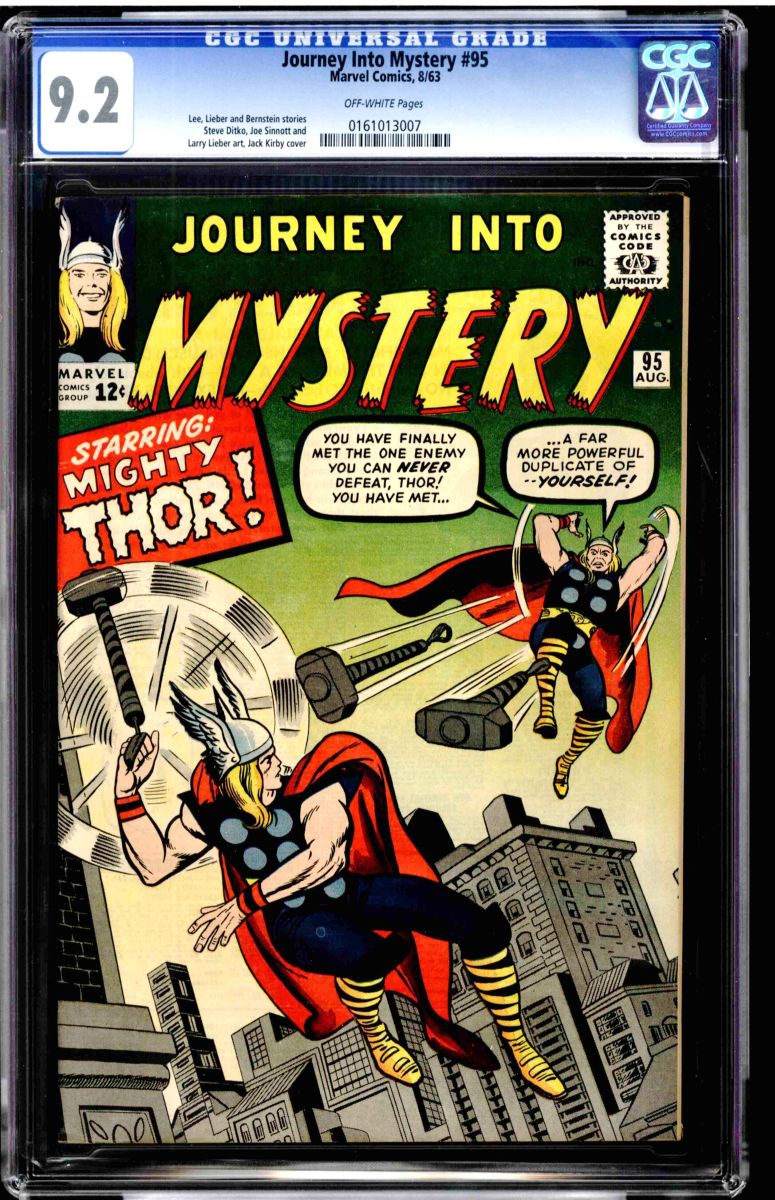 Journey Into Mystery #95 CGC 9.2 off white pages. Lee, Lieber and Bernstein stories. Steve Ditko, Joe Sinnott, and Larry Lieber art, Jack Kirby cover. Overstreet 2009 NM 9.2 value = $750. The CGC universal census reports 3 at 9.2 and 3 higher.