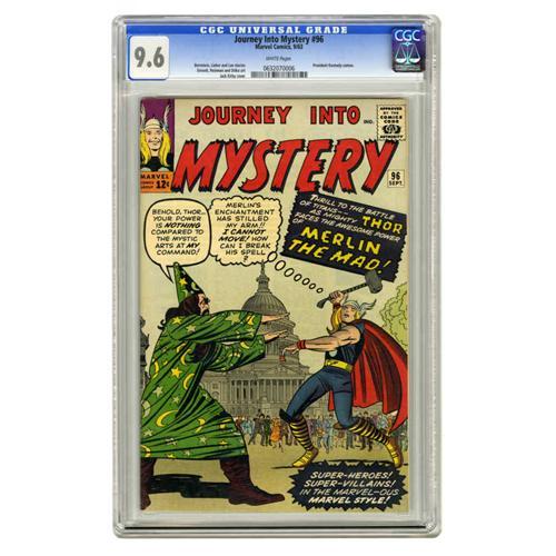 <B>Journey Into Mystery #96 (Marvel, 1963) CGC NM+ 9.6 White pages.</B></I> Thor takes on Merlin in this issue, which has a Jack Kirby cover and Joe Sinnott interior art. This being a book with <B>Mystery</B></I> in the title, it's appropriate that there are two eerie backup features with art by Steve Ditko and Paul Reinman respectively. By the way, the Thor yarn even has an appearance by John F. Kennedy and his daughter Caroline. Ask not what your comic collection can do for you, ask what you can do for your comic collection! Overstreet 2005 NM- 9.2 value = $490. CGC census 12/05: 4 in 9.6, none higher.