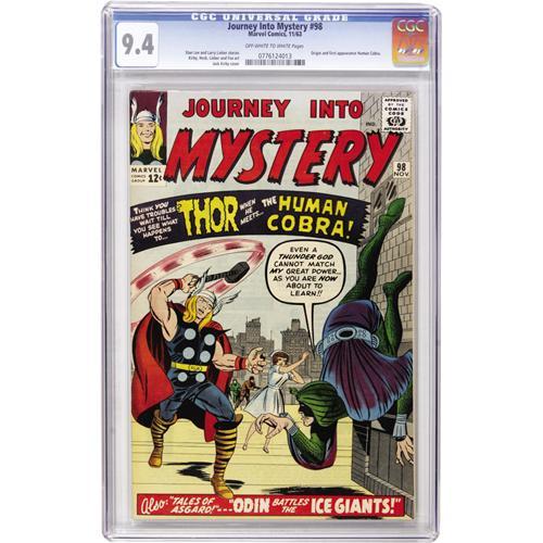 <B>Journey Into Mystery #98 (Marvel, 1963) CGC NM 9.4 Off-white to white pages.</B></I> We see this one in VF or thereabouts all the time, but never in 9.2 or above until today! It's the first appearance of the Cobra (whom they called "The Human Cobra" in this first story). That costumed weirdo would be back for several future <B>Journey</B></I> outings, when he wasn't busy entering in Vanisher lookalike contests! Jack Kirby is credited with the cover. Overstreet 2006 NM- 9.2 value = $450. CGC census 3/07: 5 in 9.4, 4 higher.<BR><BR><b>Shipping:</b> Comics - Slabbed (certified) (<a target="_blank" href="http://www.heritageauctions.com/common/shipping.php">view shipping information</a>)