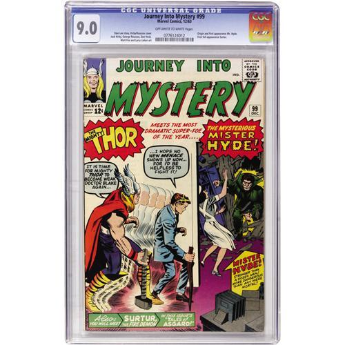 <B>Journey Into Mystery #99 (Marvel, 1963) CGC VF/NM 9.0 Off-white to white pages.</B></I> First appearance of Mr. Hyde. Jack Kirby cover. Overstreet 2006 VF/NM 9.0 value = $330; NM- 9.2 value = $450. CGC census 3/07: 6 in 9.0, 13 higher.<BR><BR><b>Shipping:</b> Comics - Slabbed (certified) (<a target="_blank" href="http://www.heritageauctions.com/common/shipping.php">view shipping information</a>)