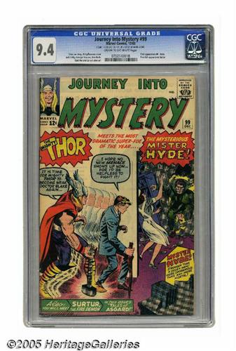 <B>Journey Into Mystery #99 (Marvel, 1963) CGC NM 9.4 Cream to off-white pages.</B></I> Mr. Hyde and Surtur make their first appearances in the Thor feature story by Jack Kirby. These early <B>Journey Into Mystery</B></I>s are often tougher to find in high grades than some of the other Marvel titles. Overstreet 2005 NM- 9.2 value = $400. CGC census 7/05: 5 in 9.4, 3 higher. <I>From the collection of Joe and Nadia Mannarino.</B></I>