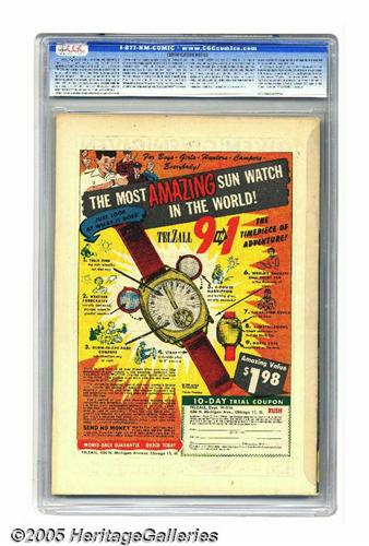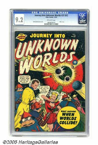 <B>Journey Into Unknown Worlds #37 (#2) (Atlas, 1950) CGC NM- 9.2 Off-white pages.</B></I> This isn't just the highest-graded copy of this book in CGC's census, it's the only one graded above 8.0! A cataclysmic cover scene by Bill Everett leads into a story with Everett art. The issue also has work by Gene Colan, from back when he was too young to be "the Dean!" There's also a Hitler appearance, noteworthy since the issue is from 1950. Overstreet 2005 NM- 9.2 value = $1,325. CGC census 5/05: 1 in 9.2, none higher.
