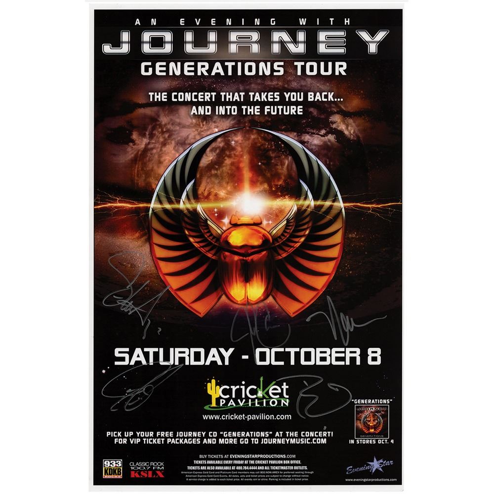 Color 11 x 17 lightweight poster for a Journey concert at the Cricket Pavilion in Phoenix, Arizona, on October 8, 2005, as part of their ‘Generations Tour,’ signed in silver ink by Neal Schon, Jonathan Cain, Deen Castronovo, Ross Valory, and Steve Augeri. In fine condition, with scattered light creasing. The consignor notes that the autographs were obtained in person.