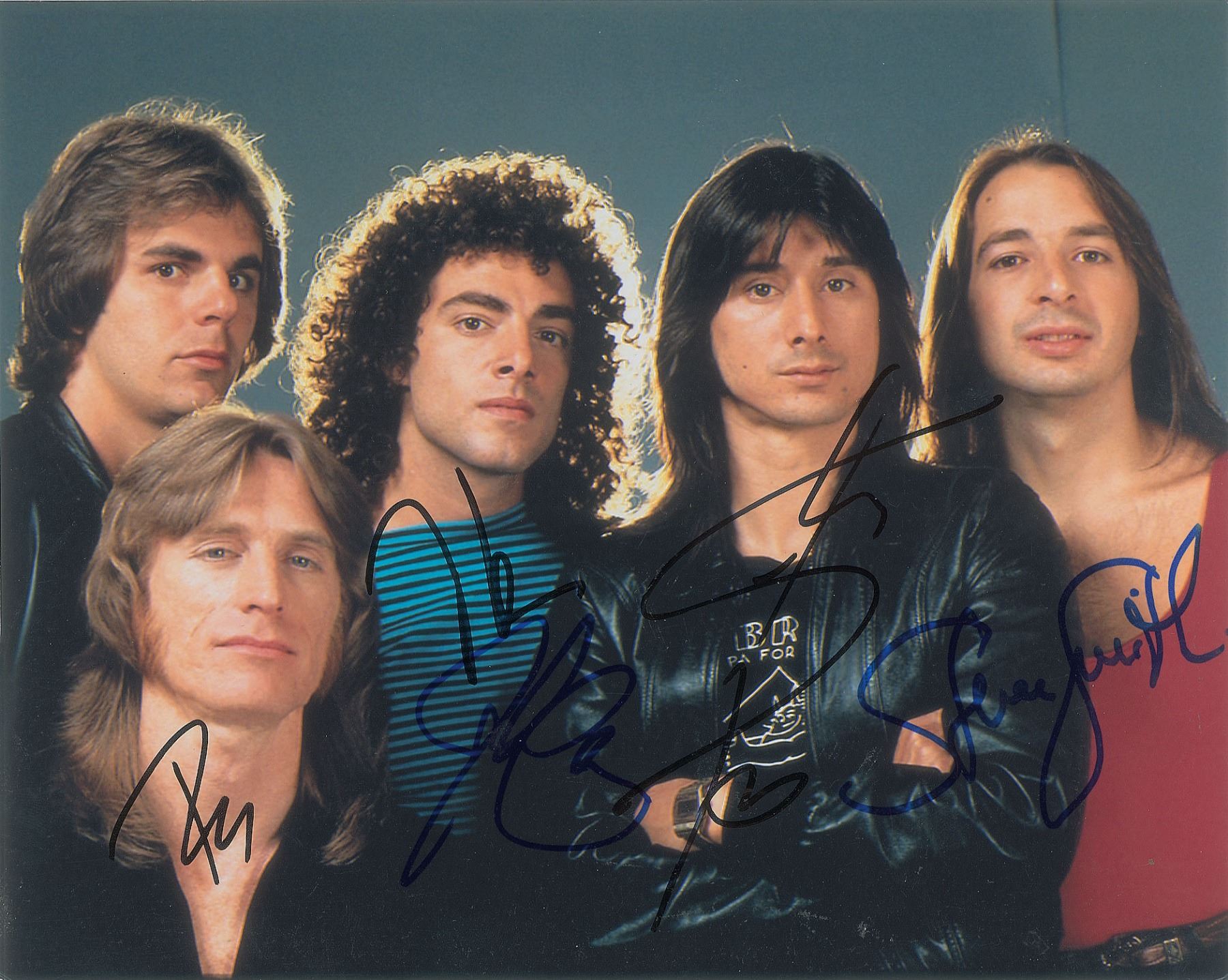 Color satin-finish 10 x 8 photo of Journey during the 1980s, signed in blue or black felt tip by Steve Perry, Neal Schon, Ross Valory, Steve Smith, and Jonathan Cain. In fine condition. Accompanied by a full letter of authenticity from JSA.