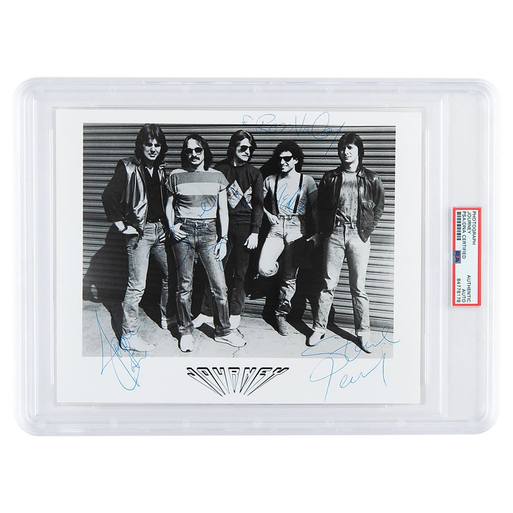 Glossy 10 x 8 publicity photo of Journey, signed in blue ballpoint by Steve Perry, Neal Schon, Jonathan Cain, Ross Valory, and Steve Smith. In fine condition. Encapsulated in a PSA/DNA authentication holder.