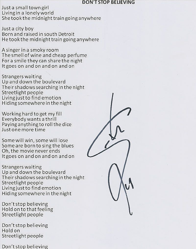 Satin-finish 11 x 14 photo of the lyrics to ‘Don’t Stop Believing,’ signed in person in black In fine condition, with lyrics a bit grainy. Originally obtained by in-person specialist Mike Wehrmann.