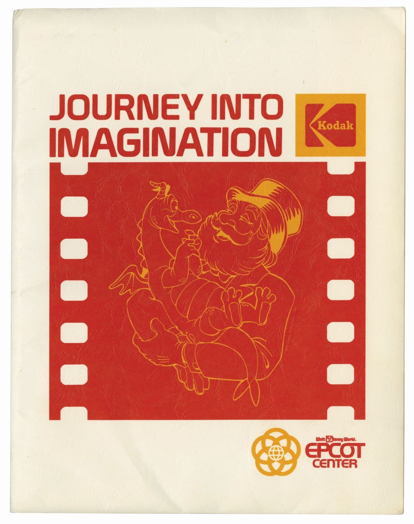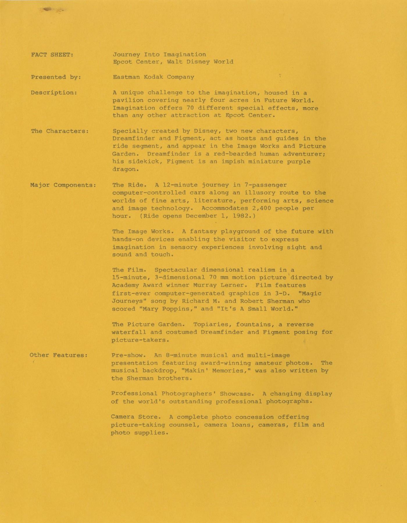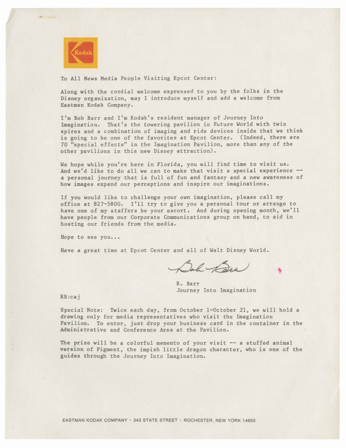 (Epcot, 1982) An incredibly rare press kit created by Kodak for their involvement in sponsoring the Imagination Pavilion at Epcot. The press kit discusses the pavilion itself, the soon to open attraction, and provides early information on Dreamfinder and Figment. Included within this kit are (8) sample press release stories, (5) black and white photos of the pavilion as well as Dreamfinder and Figment, a cover letter by Bob Barr of Kodak, and a quick fact sheet. The kit is contained within stylish 11.5"x9" folder. The condition is very good overall with some minor surface wear to the folder from use.
