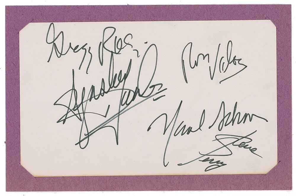 In-person felt tip signatures of Steve Perry, Neal Schon, Ross Valory, Gregg Rolie, and Aynsley Dunbar on an off-white 5 x 3 card. In fine condition, with a bit of mild toning to bottom edge.