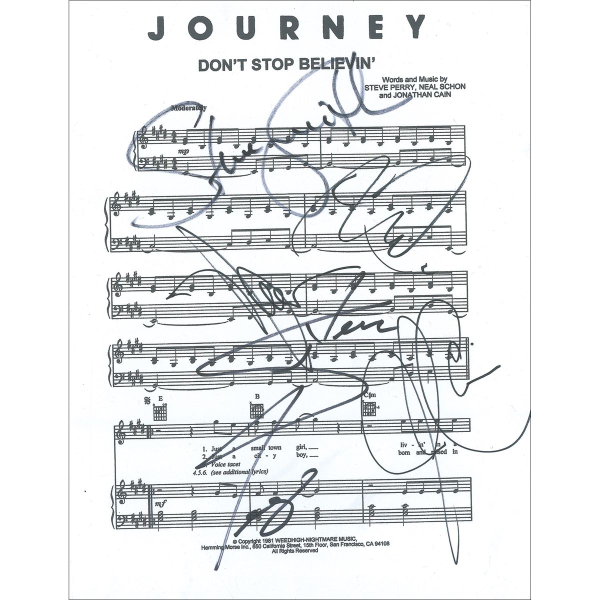 Printed sheet music for ‘Don’t Stop Believin’, five pages, 8.5 x 11, signed in black felt tip on the front page by Steve Smith, Ross Valory, Jonathan Cain, Neal Schon, and Steve Perry. In fine condition.