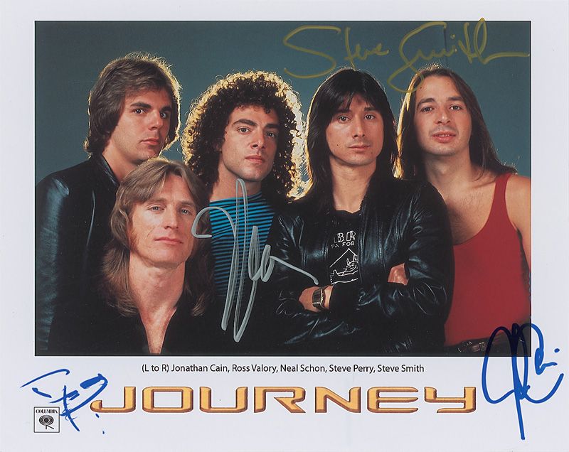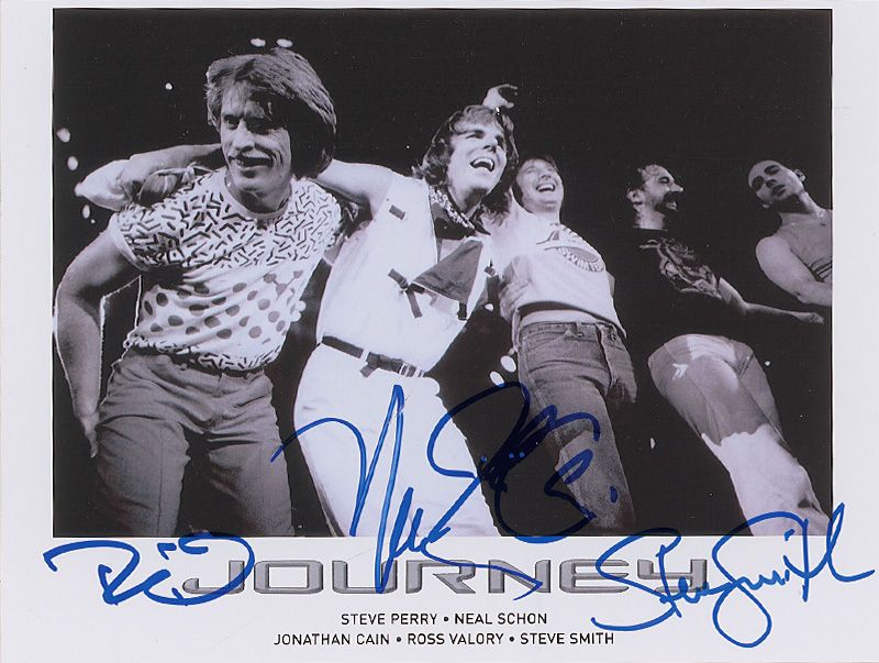 Two different glossy 10 x 8 group photos, one color, each signed in ink or felt tip by Neal Schon, Ross Valory, Steve Smith, and Jonathan Cain. In fine condition.