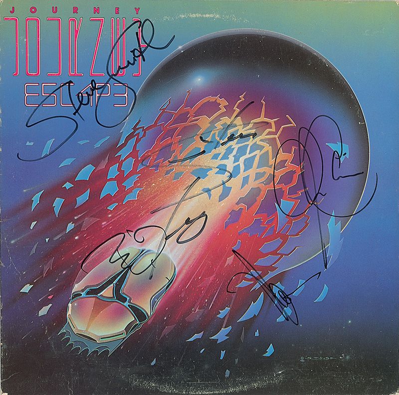 Escape album signed on the front cover in black felt tip by Steve Perry, Neal Schon, Jonathan Cain, Ross Valory, and Steve Smith. A crease to the lower left, typical ‘ring of wear,’ and Perry’s signature a shade light, otherwise fine condition. The record is included.