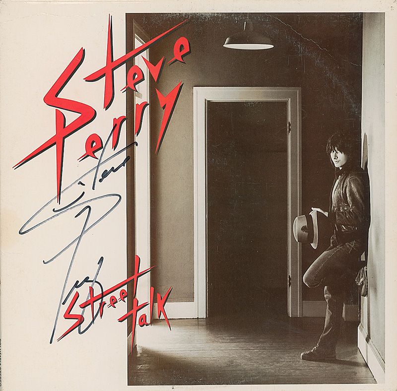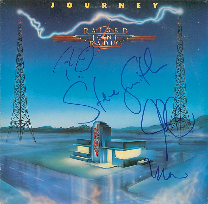 Street Talk album, signed on the front cover in black felt tip by Steve Perry; and Raised on Radio, signed on the front cover in blue felt tip by Steve Smith, Jonathan Cain, and two others. The records are not included. In fine condition, with scattered creases and a mild ‘ring of wear’ to Perry’s cover.