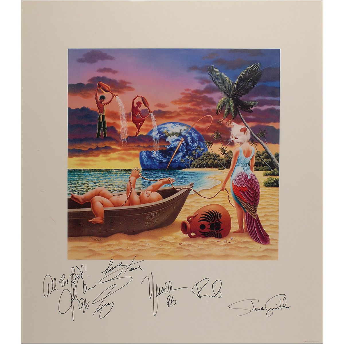 Color 25 x 28 print of the Trial by Fire album cover, signed in the lower border in black felt tip by Neal Schon, Steve Perry, Steve Smith, Jonathan Cain, and Ross Valory. Rolled and in fine condition, with scattered edge dings and creases.