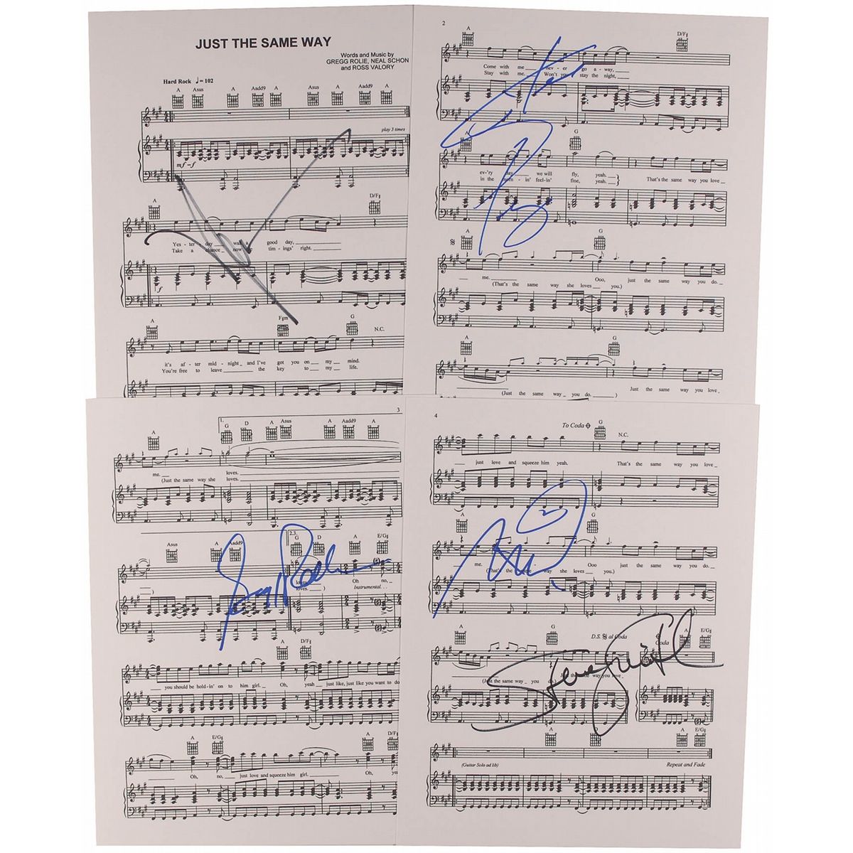Sheet music to ‘Just the Same Way,’ four cardstock pages, 8.5 x 11, signed on each page in felt tip by members of Journey. Signers are: Steve Perry, Neal Schon, Ross Valory, Steve Smith, and Gregg Rolie. In very fine condition.