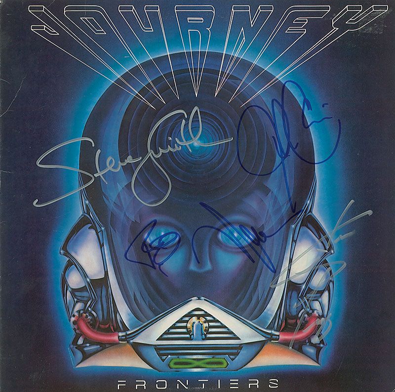 Frontiers album signed on the front cover in blue felt tip and silver ink by Steve Perry, Neal Schon, Jonathan Cain, Ross Valory, and Steve Smith. In fine condition, with a light crease to the upper left and adhesive remnants to the upper right corner. Th