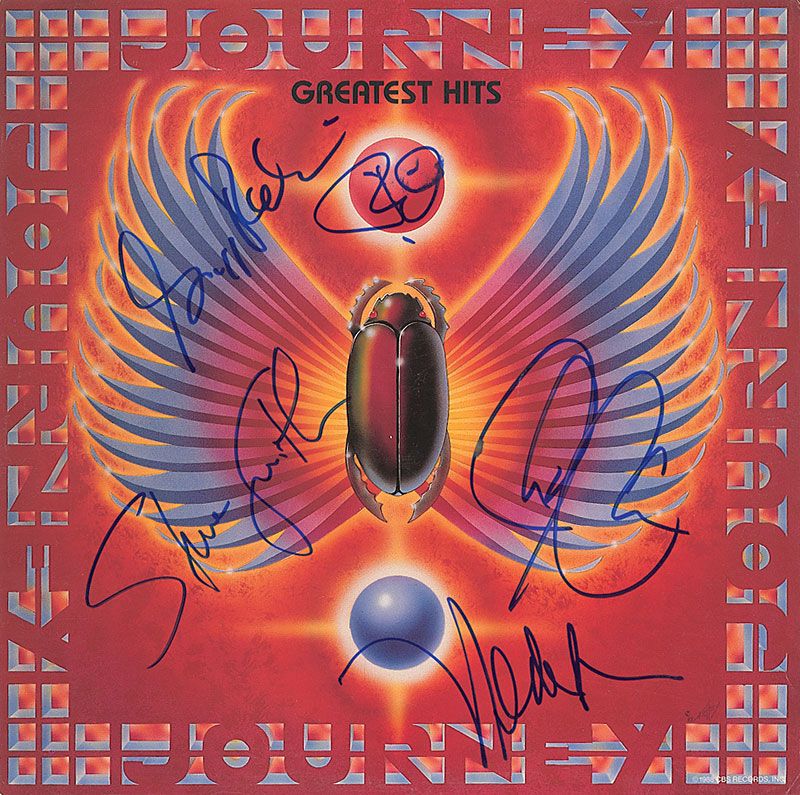 Greatest Hits album flat signed on the front in blue felt tip by Gregg Rolie, Steve Smith, Neal Schon, Jonathan Cain, and Ross Valory. In fine condition, with a light brush to Valory’s signature and a couple small corner tip creases.