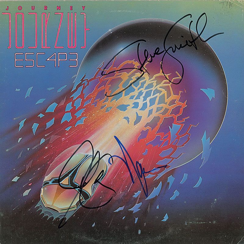 Escape album signed on the front cover in blue and black felt tip by Steve Smith, Jonathan Cain, and Neal Schon. In fine condition, with a couple corner creases and a small notation to top right corner. The record is included.