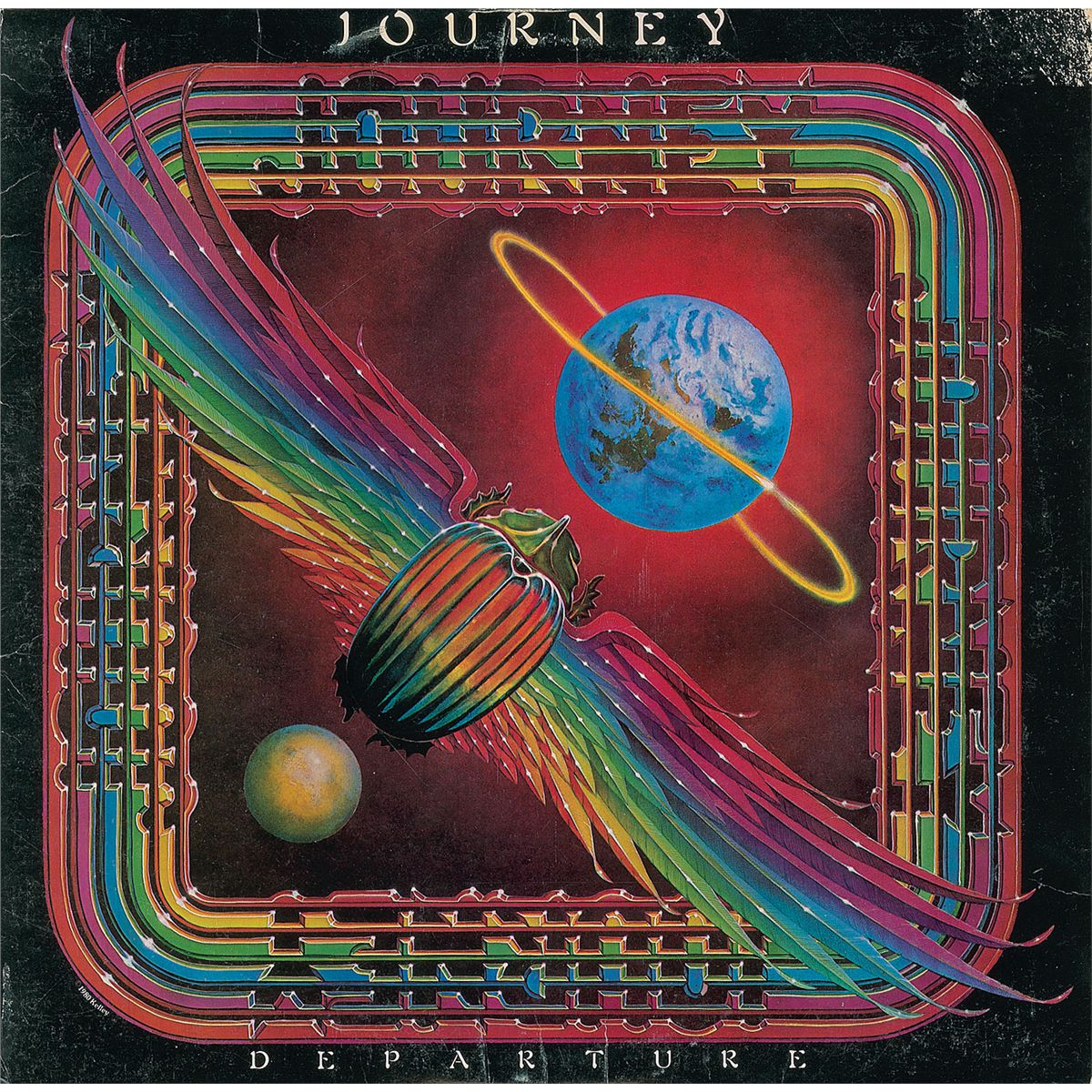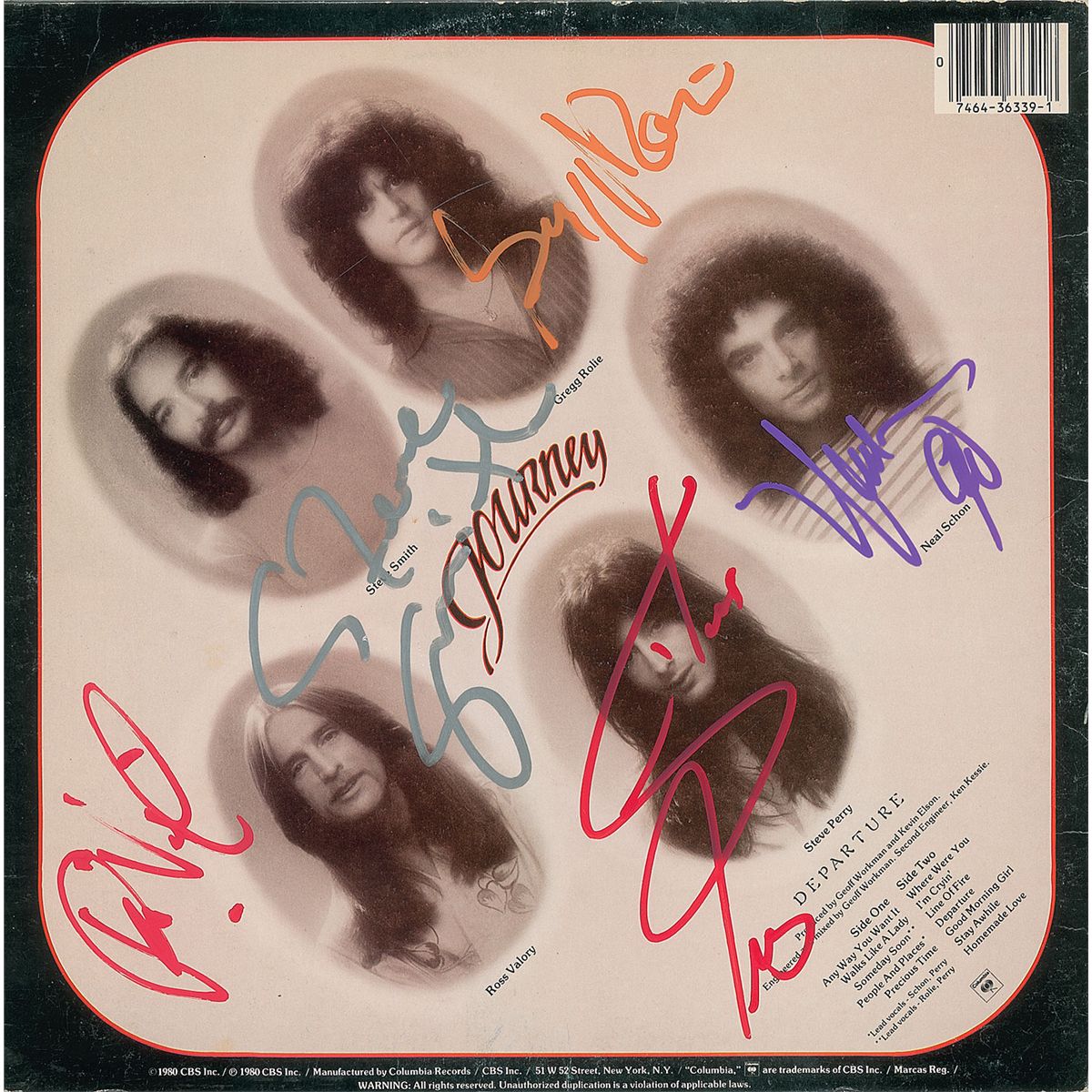 Departure album signed on the back cover in various color inks by Steve Perry, Gregg Rolie, Steve Smith, Ross Valory, and Neal Schon. In fine condition, with scattered light creases and edge wear to covers, and a small area of slight surface loss to front cover from a removed label. The record is included.
