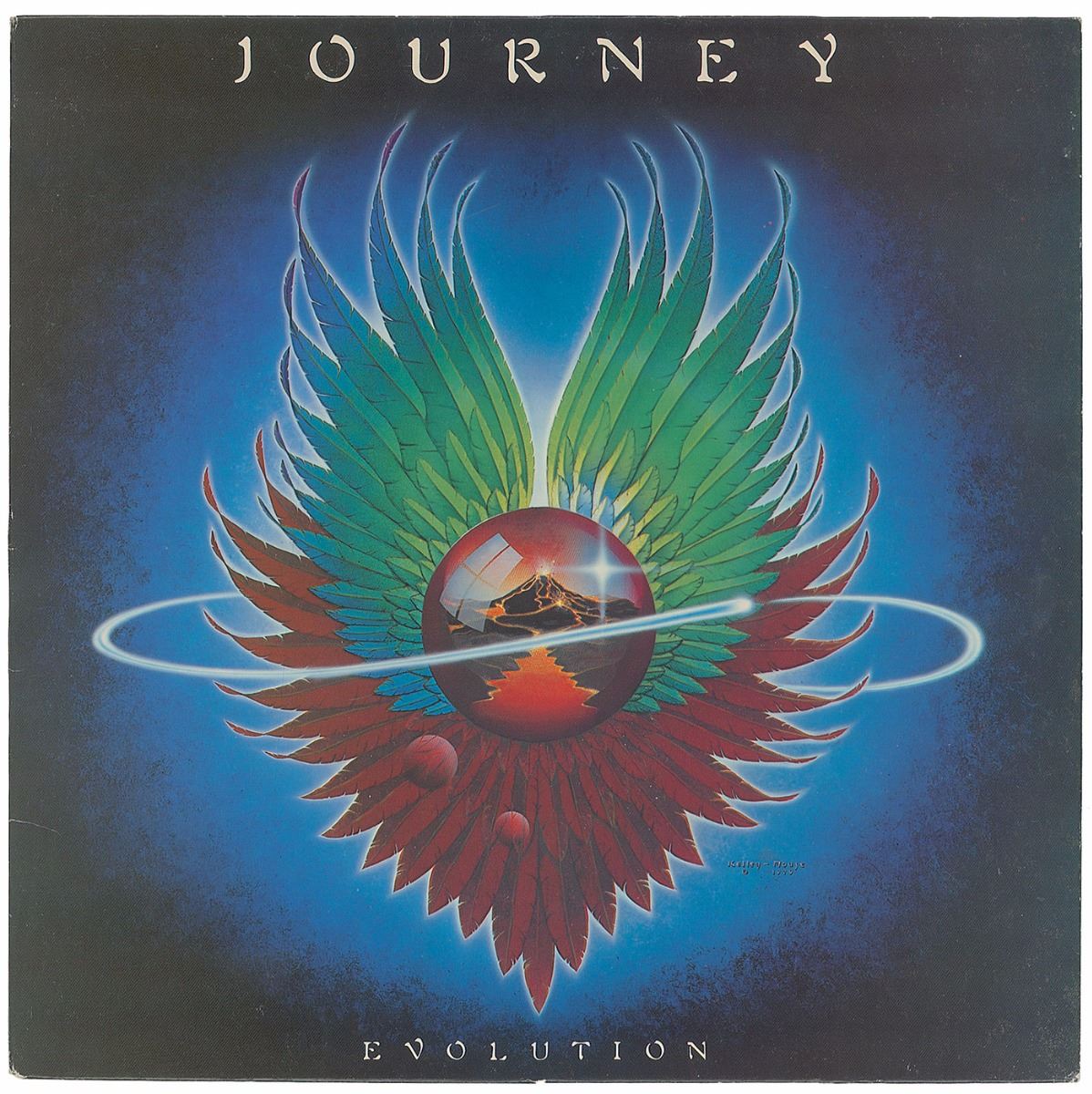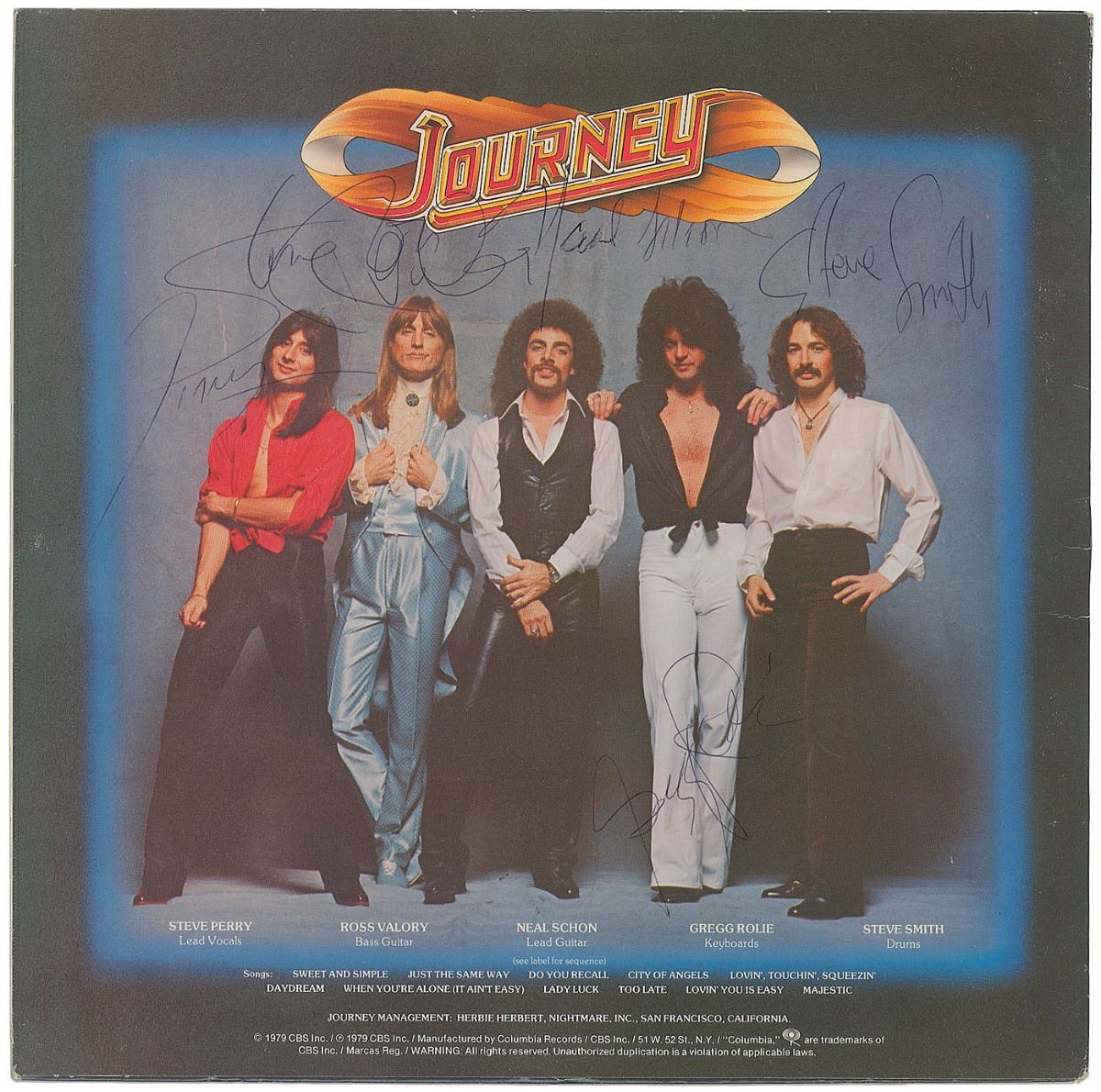 Evolution album signed on the back cover in blue ballpoint by Steve Perry, Neal Schon, Gregg Rolie, Ross Valory, and Steve Smith. In fine condition, with some light rubbing and edgewear, and several unsuccessful signature attempts by Schon. The record is not included.
