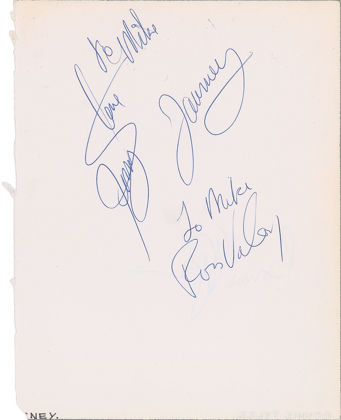Vintage circa late 1970s blue ballpoint signatures and inscriptions, "To Mike, Neal Schon, Journey," "To Mike, Gregg Rolie," "Steve Smith," "To Mike, Ross Valory," and "To Mike, Steve Perry, Journey," on a pair of off-white 7.5 x 9.75 album pages. The reverse of the Schon page is signed and inscribed by Manfred Mann, and the reverse of the Perry page is signed by Bonnie Tyler. In fine condition.