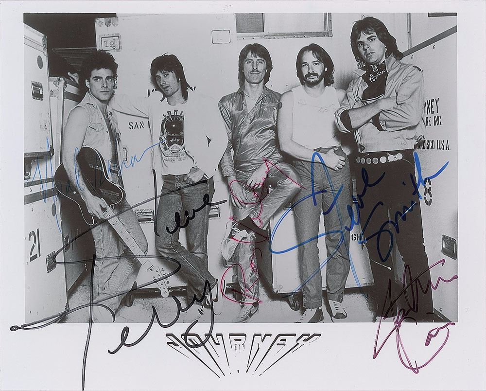 Glossy 10 x 8 publicity photo of Journey standing with their touring equipment, signed in various ink types by Steve Perry, Neal Schon, Ross Valory, Jonathan Cain, and Steve Smith. In fine condition.