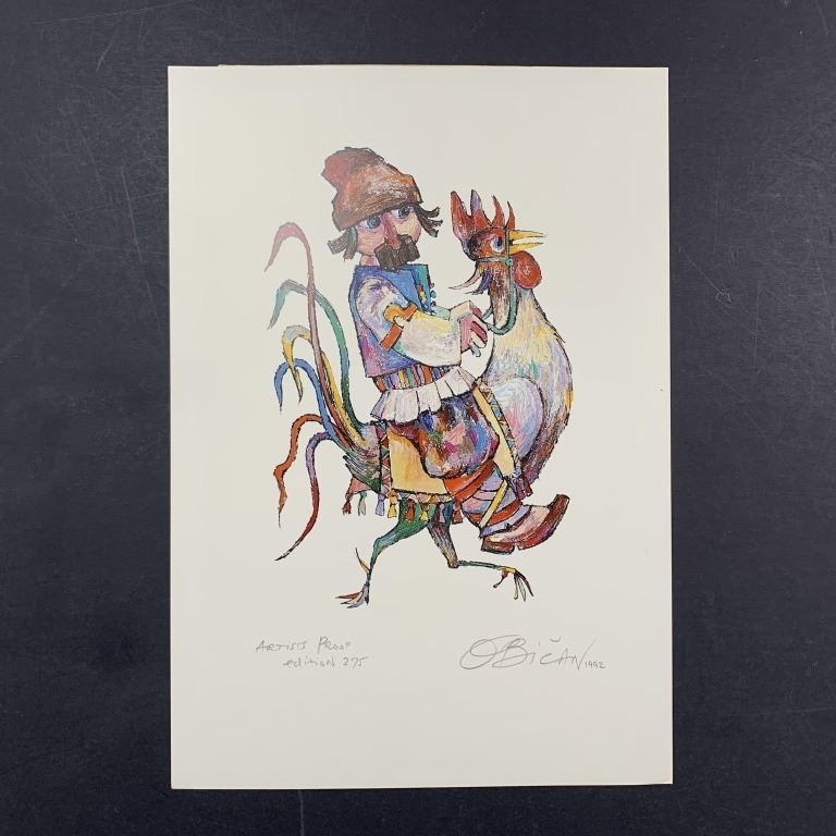 Jovan Obican's "Riding the Rooster" limited edition print, signed and dated lower right, and numbered Artist Proof Edition 275. This piece is of a man riding a rooster, done in Obican's signature colourful style. This piece is in excellent condition with a miniscule crease lower right corner.