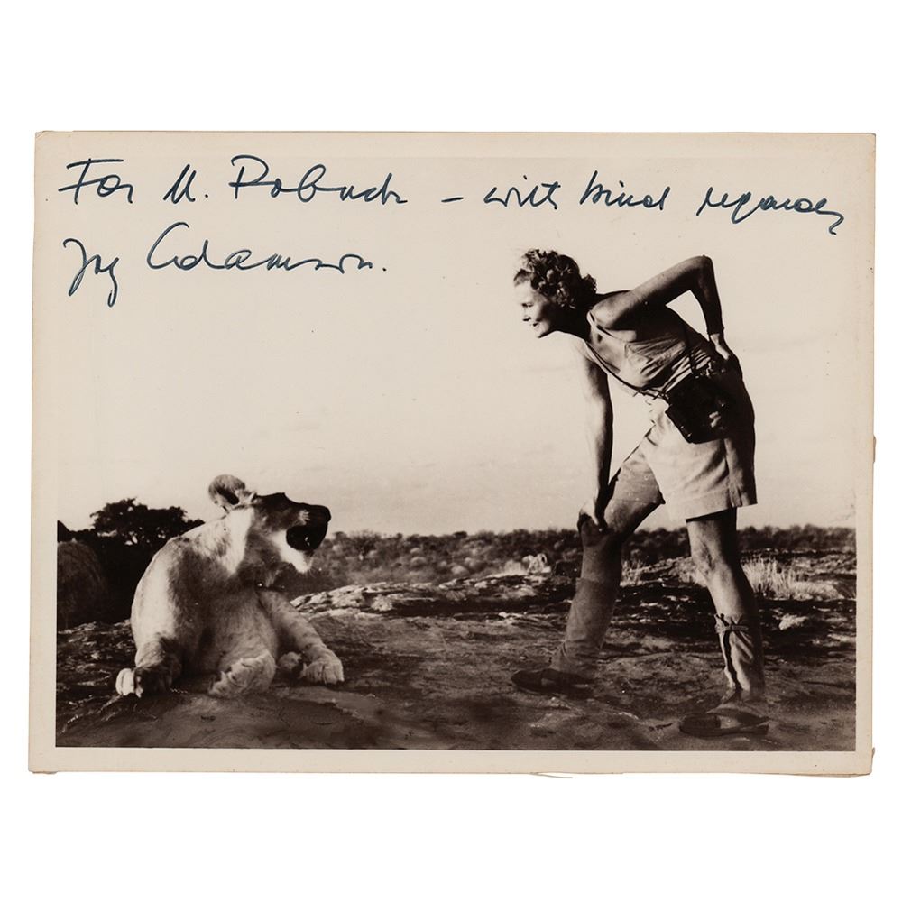 Vintage matte-finish 8.5 x 6.5 full-length photo of Adamson up close and personal with Elsa the lion, signed and inscribed in black felt tip, "For M. Robuck—with kind regards, Joy Adamson." In very good to fine condition, with a vertical crease to the left side.