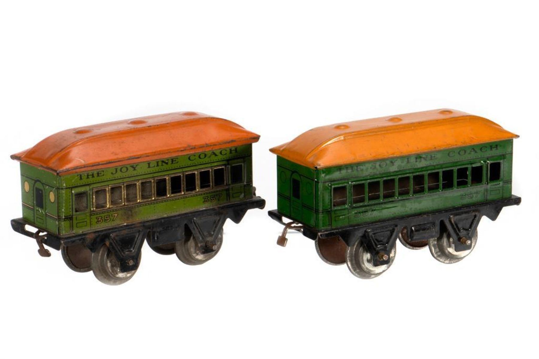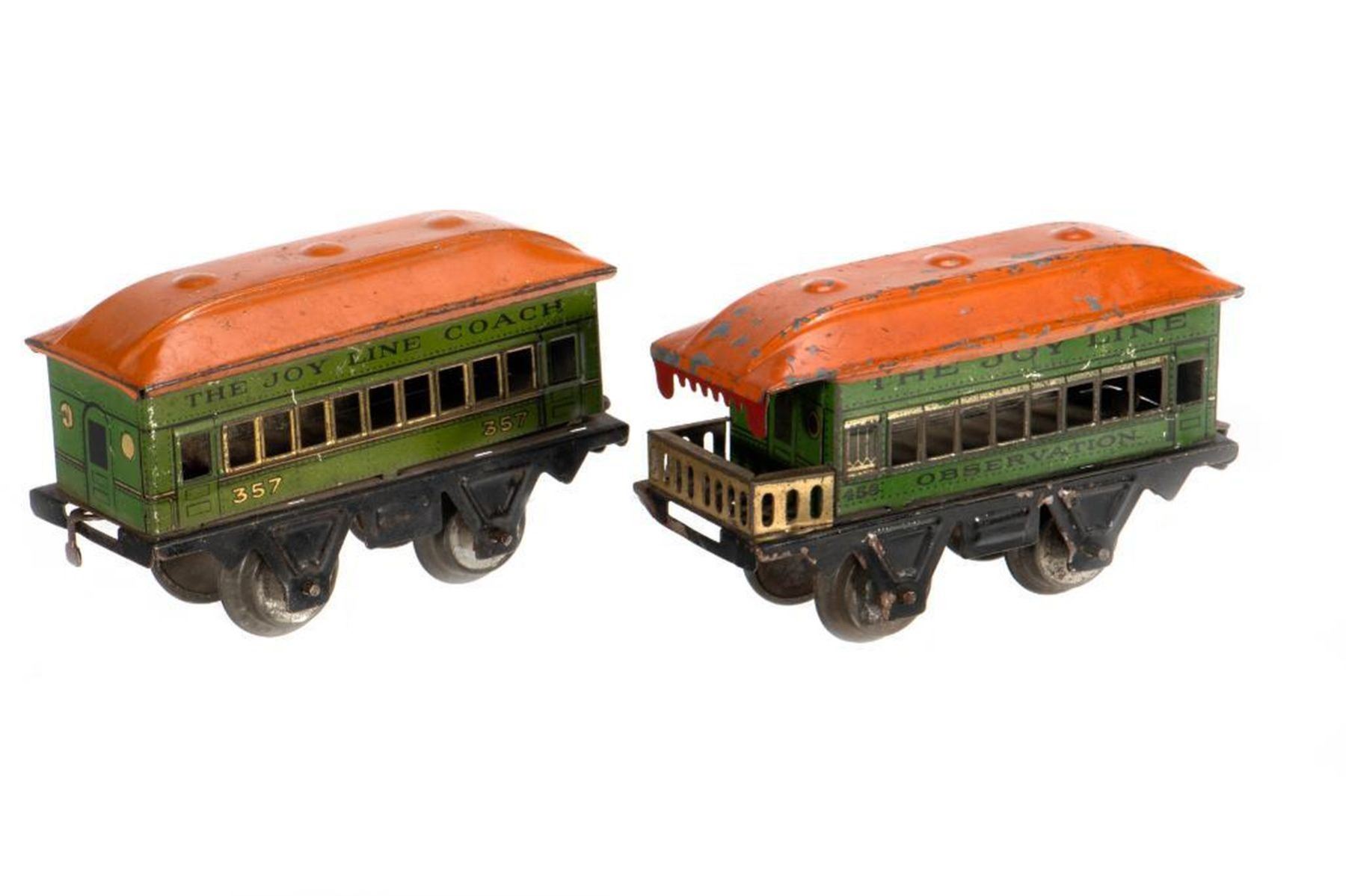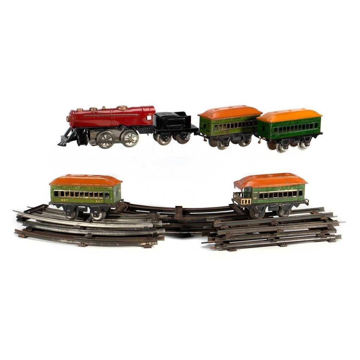 Joy Line (Marx) Red windup Loco, built in key, ringing bell, copper domes and headlight ferrule,, black four wheel Tender, 357 green litho coach with orange roof, 357 green litho coach with orange roof, 357 green litho coach with orange roof, 458 green litho observation with orange roof, Track Red windup 0-4-0 Locomotive with black frame, built in key, ringing bell. Black 4 wheel tender, 357 Green lithographed coach with orange painted roof. 357 Green lithographed coach with orange painted roof . 458 green lithographed observation with orange painted roof. Extra - slightly not matching - 357 green lithographed coach with orange roof. All roofs have edge wear and paint nicks. Wheels have oxidized, frames have nicks in the black paint. Small scratches on lithography, Rust spots on couplers and wheels.