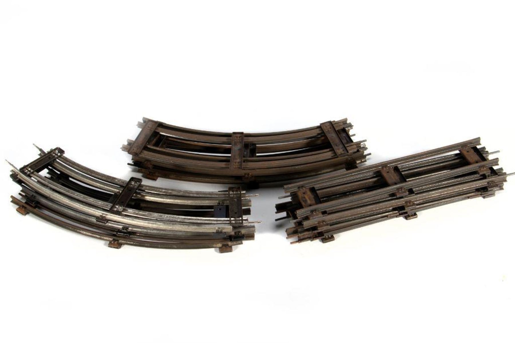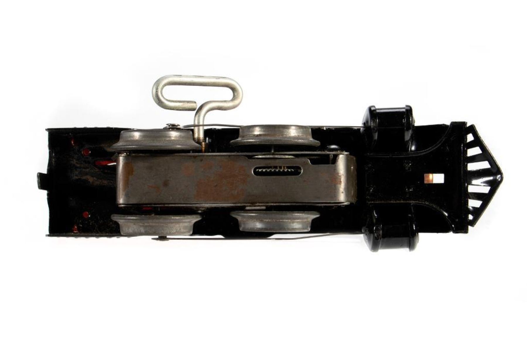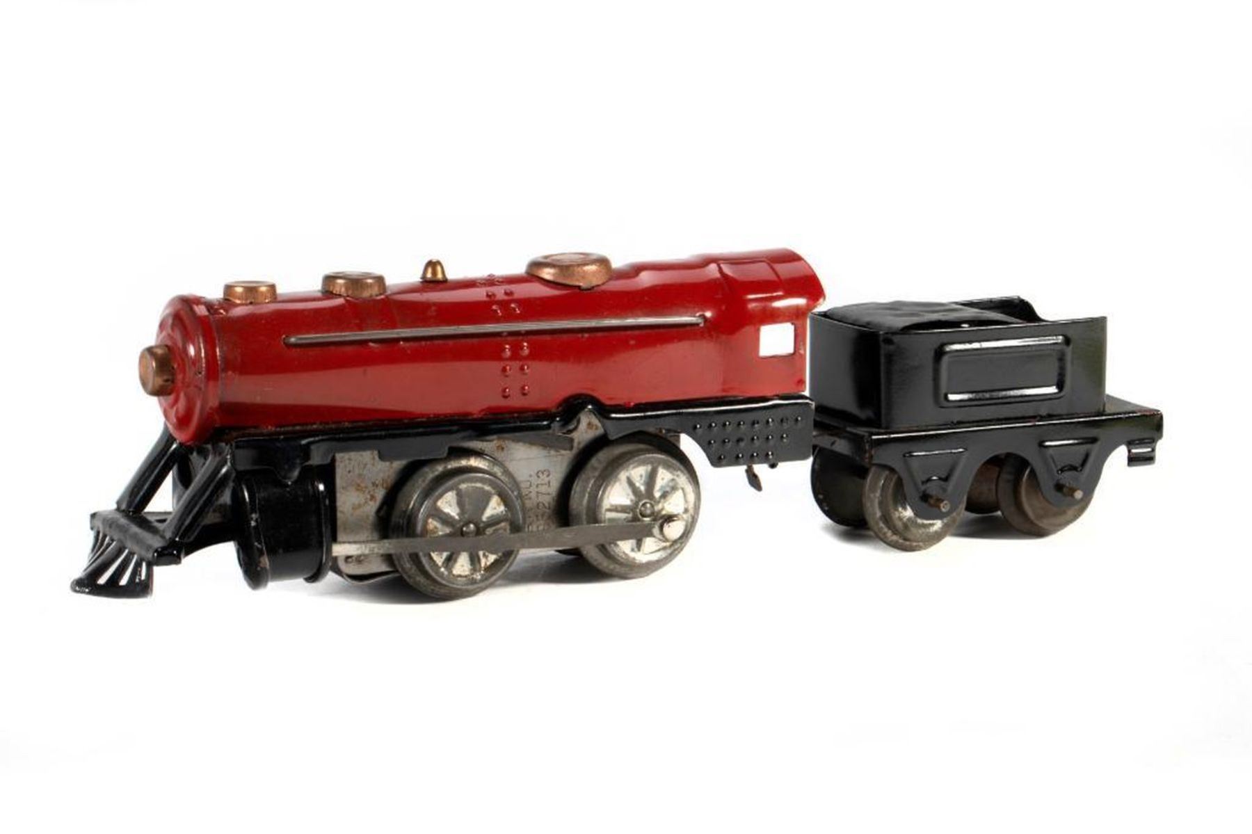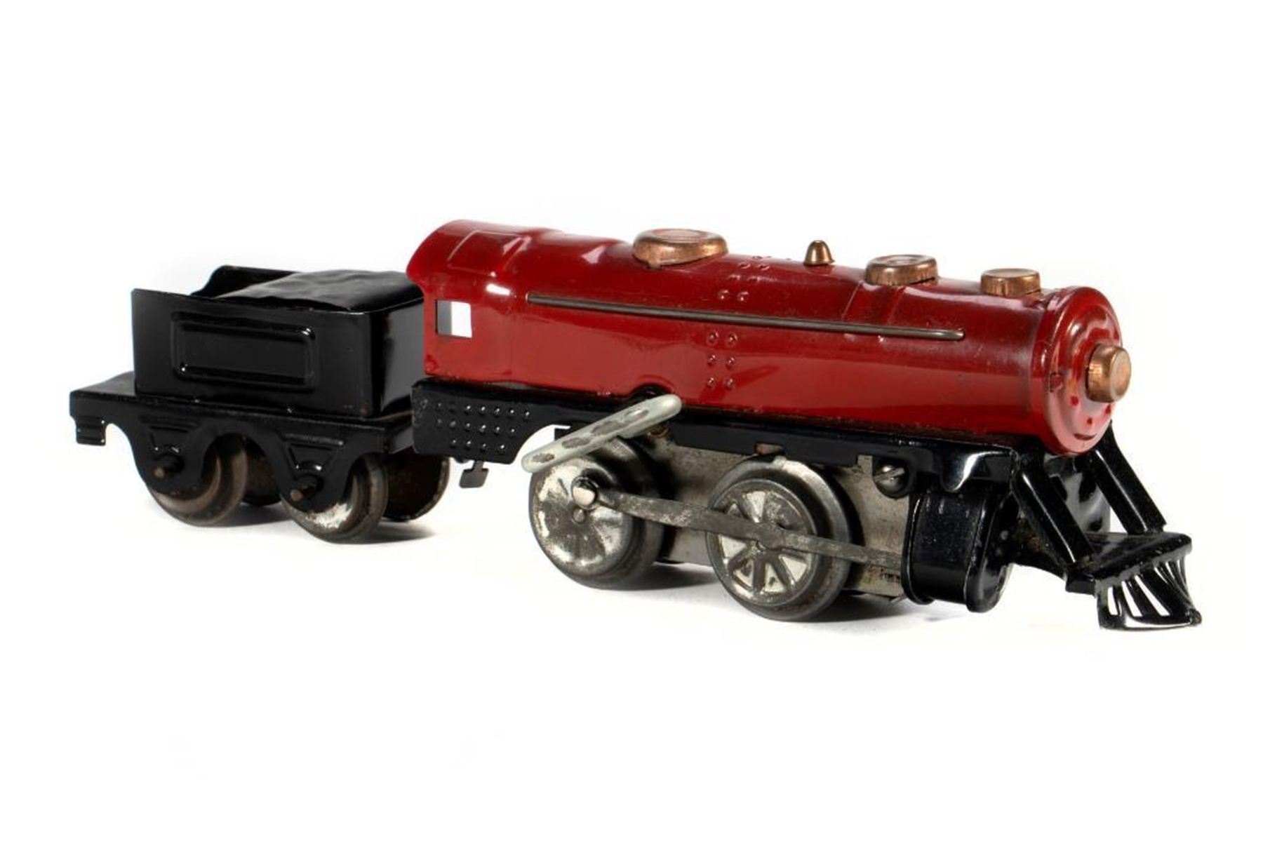 Joy Line (Marx) Red windup Loco, built in key, ringing bell, copper domes and headlight ferrule,, black four wheel Tender, 357 green litho coach with orange roof, 357 green litho coach with orange roof, 357 green litho coach with orange roof, 458 green litho observation with orange roof, Track Red windup 0-4-0 Locomotive with black frame, built in key, ringing bell. Black 4 wheel tender, 357 Green lithographed coach with orange painted roof. 357 Green lithographed coach with orange painted roof . 458 green lithographed observation with orange painted roof. Extra - slightly not matching - 357 green lithographed coach with orange roof. All roofs have edge wear and paint nicks. Wheels have oxidized, frames have nicks in the black paint. Small scratches on lithography, Rust spots on couplers and wheels.