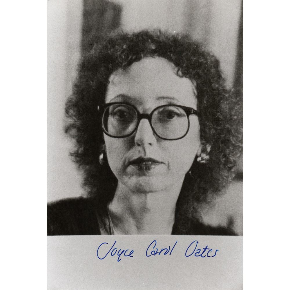 Glossy 4 x 6 head shot portrait of the highly regarded author, neatly signed in blue felt tip, "Joyce Carol Oates." In fine condition.