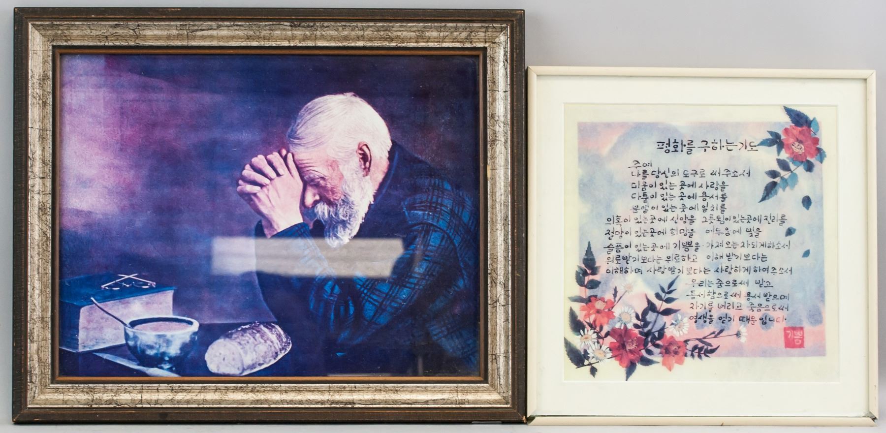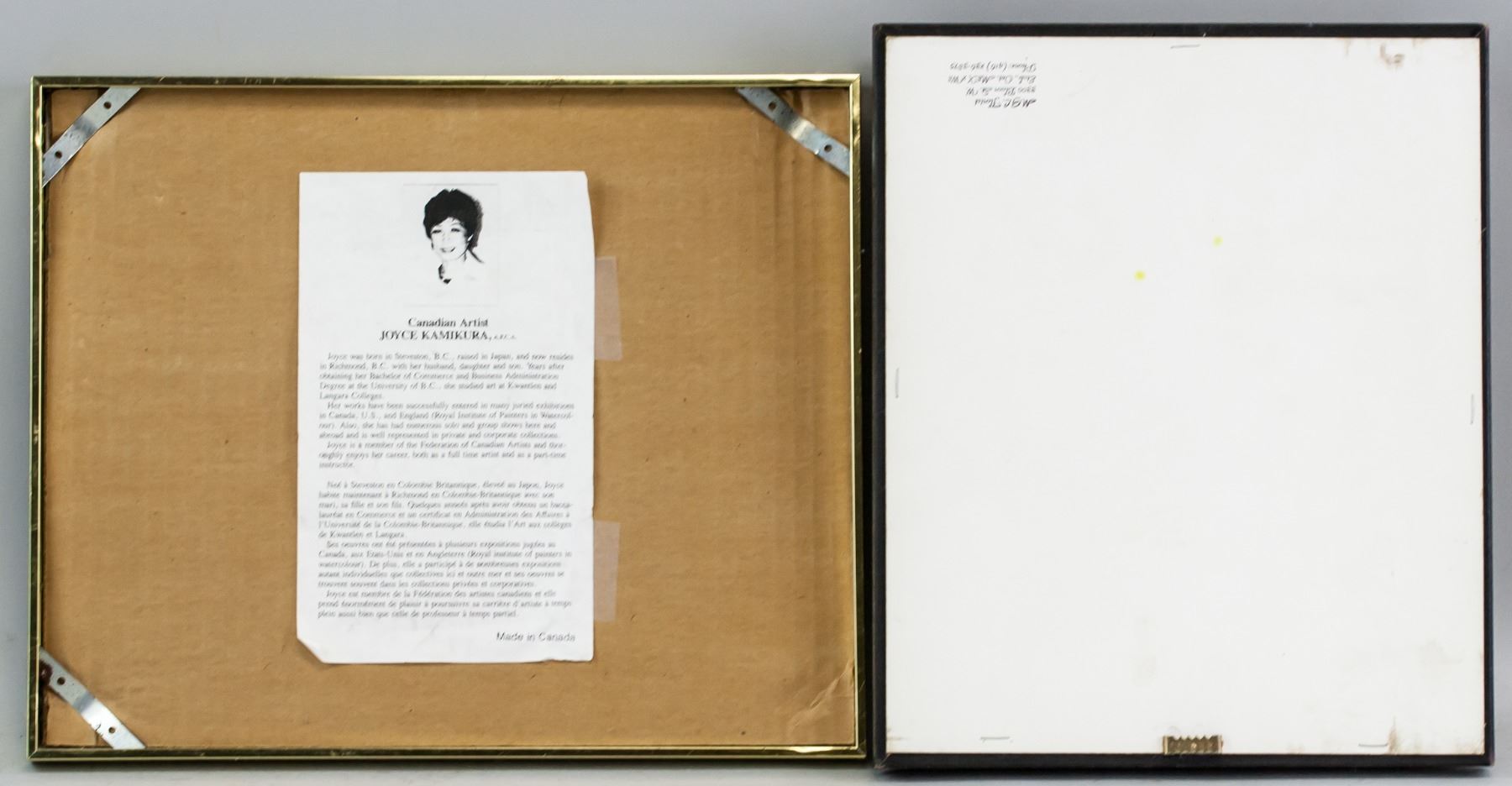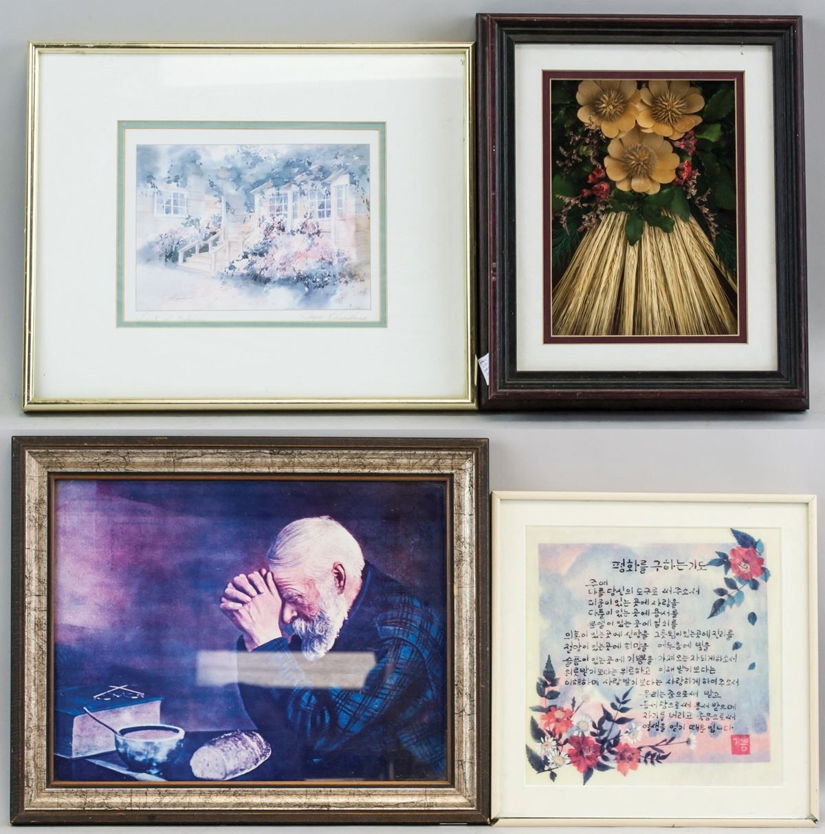 Prints and mixed media on paper, framed. Four assorted images, including a portrait of a man and Korean calligraphy. Biography of Joyce Kamikura affixed to verso of one piece. Korean text: 25 x 25 cm (9.75 x 9.75 in), Frame: 32 x 32 cm (12.5 x 12.5 in). Joyce Kamikura Print: 15 x 19 cm (5.75 x 7.5 in), Frame: 28 x 34 cm (11 x 13.25 in). Dry flower: 30 x 25 cm (12 x 9.5 in). Portrait: 28 x 38 cm (11.5 x 15 in), Frame: 37 x 46 cm (14.5 x 18 in).