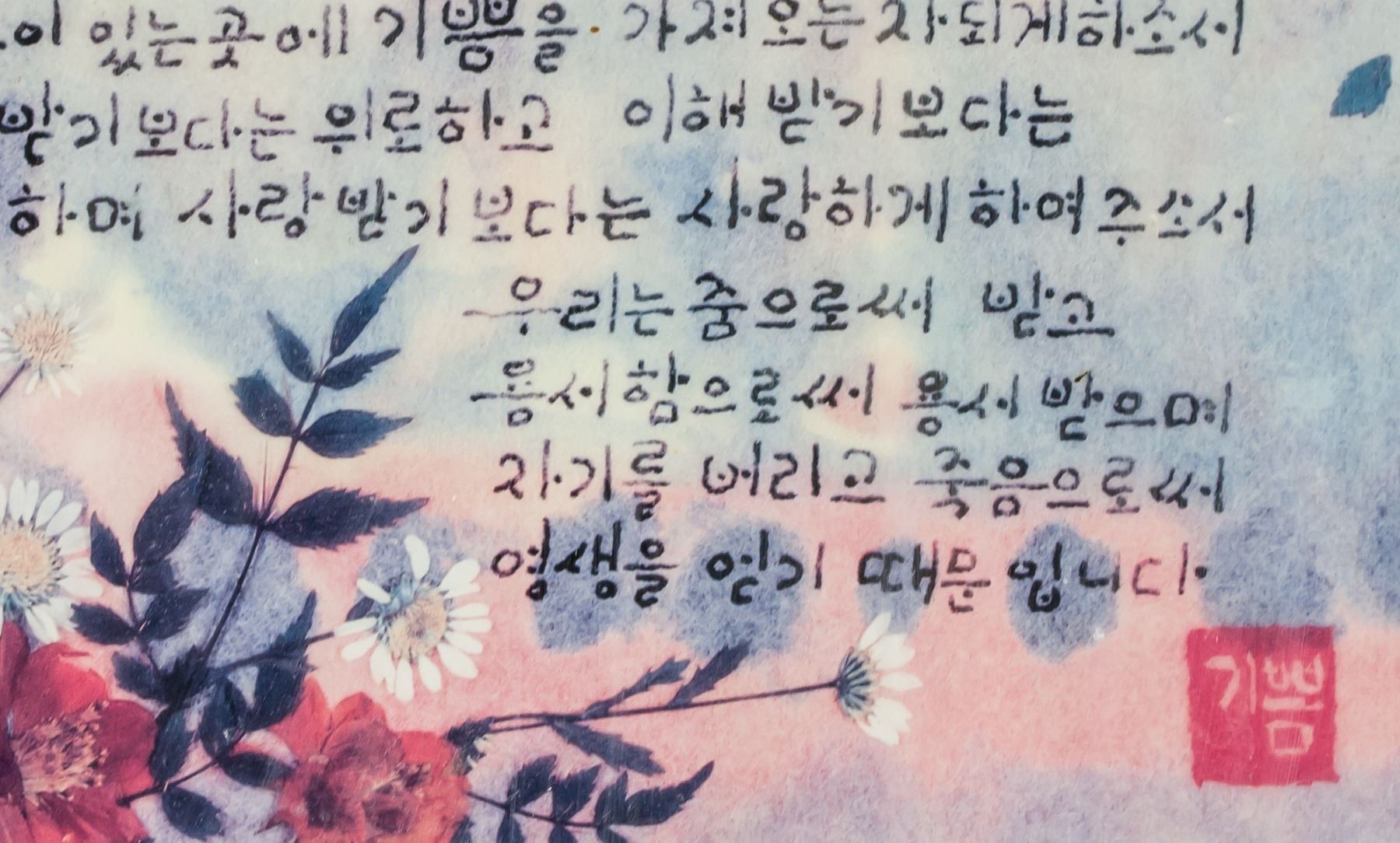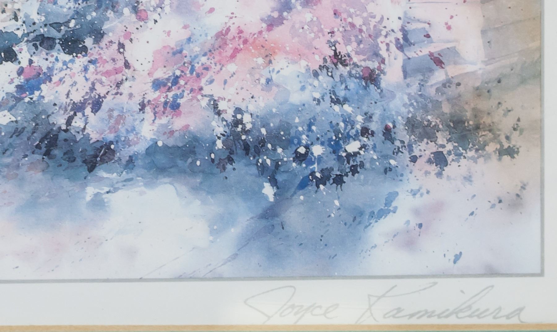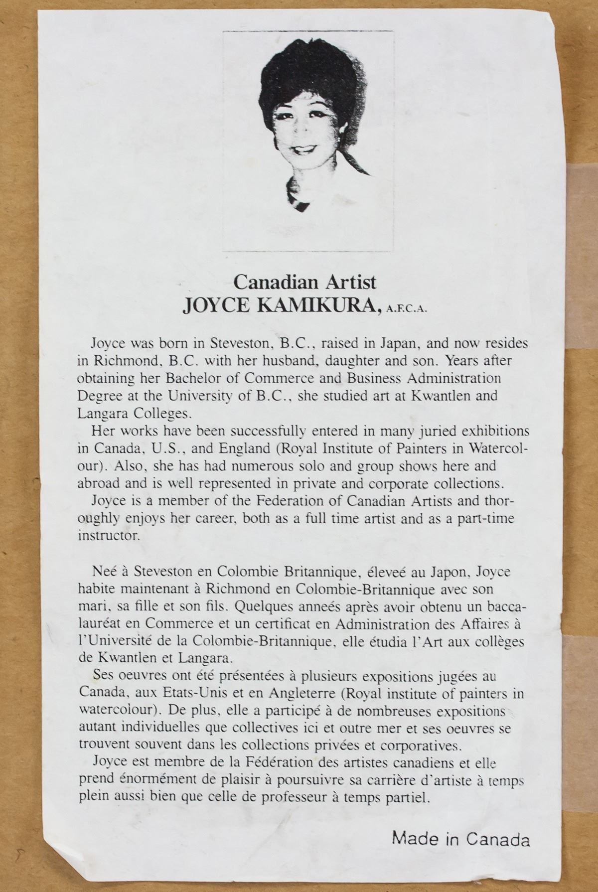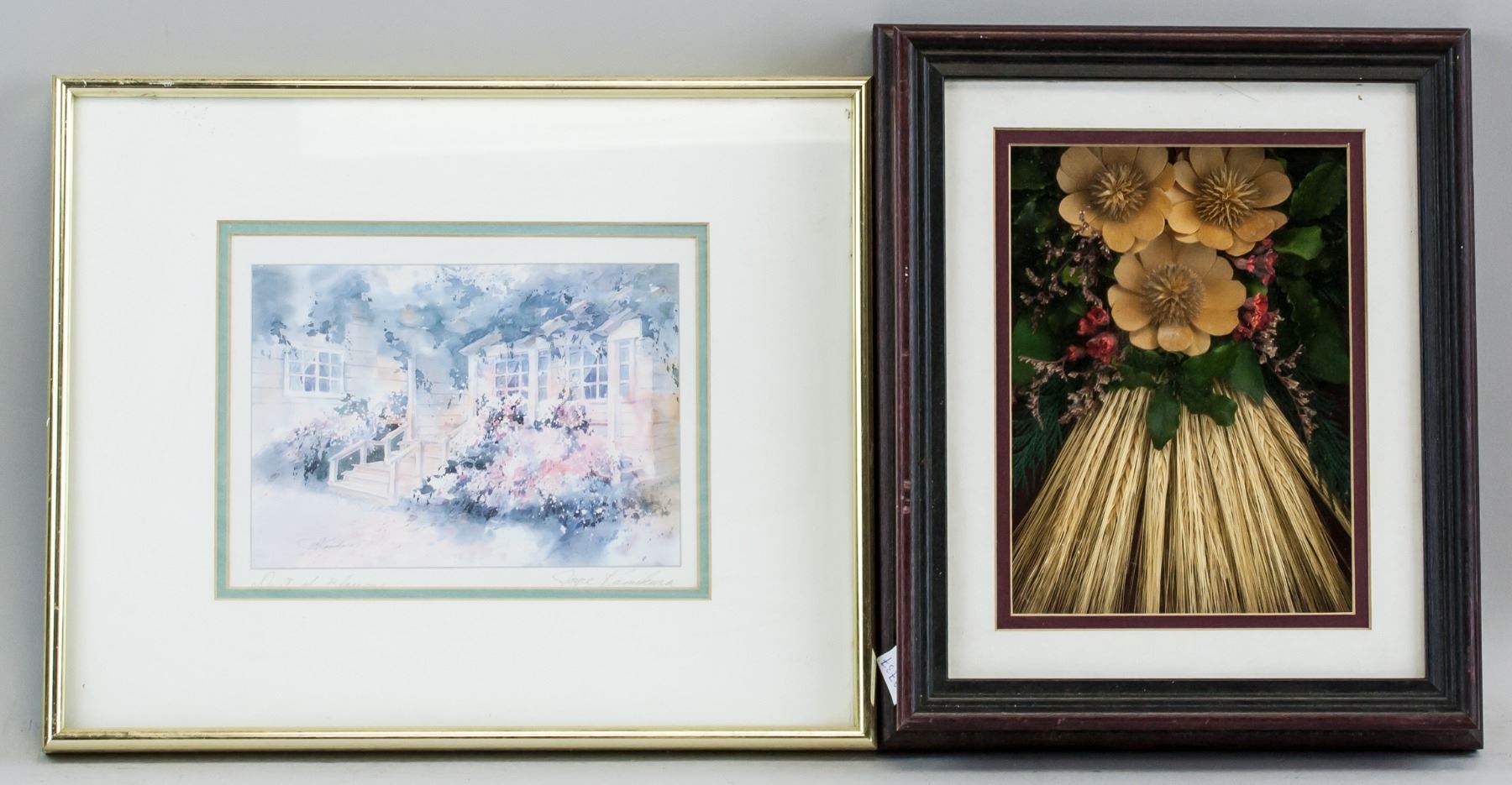 Prints and mixed media on paper, framed. Four assorted images, including a portrait of a man and Korean calligraphy. Biography of Joyce Kamikura affixed to verso of one piece. Korean text: 25 x 25 cm (9.75 x 9.75 in), Frame: 32 x 32 cm (12.5 x 12.5 in). Joyce Kamikura Print: 15 x 19 cm (5.75 x 7.5 in), Frame: 28 x 34 cm (11 x 13.25 in). Dry flower: 30 x 25 cm (12 x 9.5 in). Portrait: 28 x 38 cm (11.5 x 15 in), Frame: 37 x 46 cm (14.5 x 18 in).