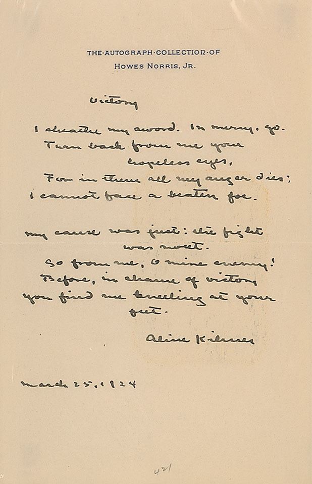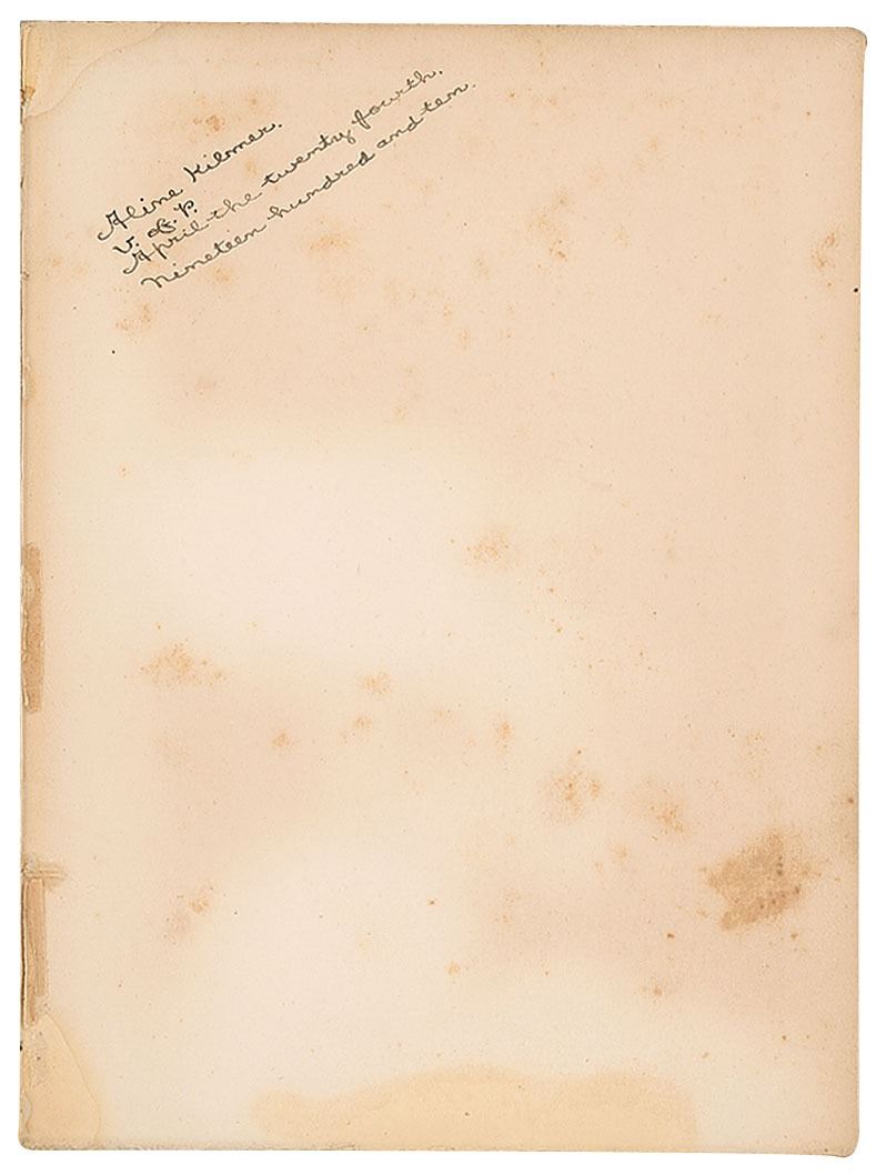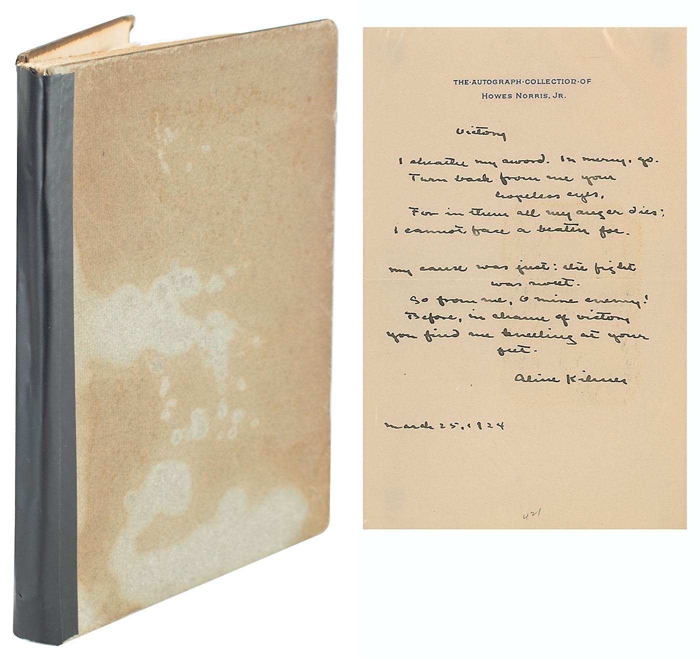 Signed book: A Wayside Lute by Lizette Woodworth Reese. First edition. Portland, Maine: Thomas B. Mosher, 1909. Hardcover, 5.5 x 7.5, 66 pages. Inscribed on the first free end page in ink to his wife, and signed using his cryptic initials, "Aline Kilmer, V. of P., April the twenty fourth, Nineteen hundred and ten." Autographic condition: very good, with staining and foxing to the signed page. Book condition: G/None, with boards detached and crudely repaired with tape, staining to boards, and foxing to textblock. Accompanied by a handwritten poem signed by Aline Kilmer, entitled "Victory," and a provenance note for the book from their granddaughter, certifying it as being from the library of Joyce and Aline Kilmer.