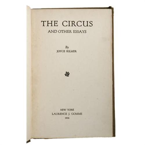 <B>Joyce Kilmer Signed:<I> The Circus and Other Essays.</B></I></B></I> (New York: Laurence J. Gomme, 1916), first edition, 79 pages, signed and dated by the author in the ffep, tan boards and brown cloth shelf back, with gilt titles, 16mo (4.5 x 6.75), hinge starting to crack between the ffep and the title page, else very good condition. <BR><BR><b>Shipping:</b> Books & Catalogs (<a target="_blank" href="http://www.heritageauctions.com/common/shipping.php">view shipping information</a>)