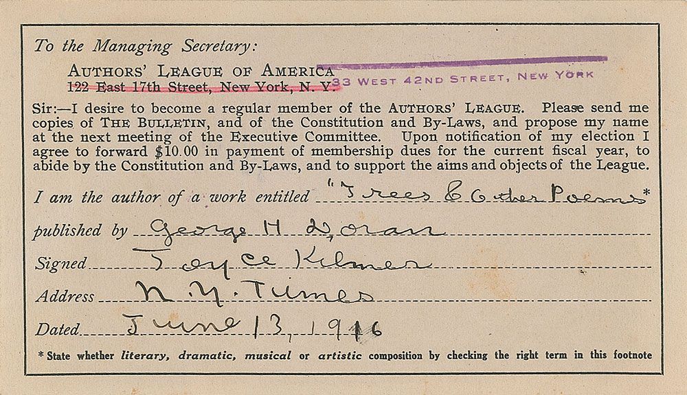 American writer (1886–1918), best known for the much-anthologized poem ‘Trees,’ who was killed at the Second Battle of Marne at the age of 31. DS one page, 5.25 x 3, June 13, 1916. Kilmer’s application to join the Author’s League of America, filled out in his hand, adding the title of his work, “Trees & Other Poems,” listing the publisher’s name, and his address, as “N. Y. Times.” In fine condition, with a couple small spots of mild toning.