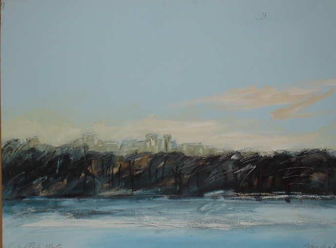 An abstract landscape of Central Park in the winter. 22x30 inch acrylic on heavyweight paper, signed by the artist. Circa 1980’s. Domestic shipping $125, International depends upon location. Joyce Rezendes studied with Diebenkorn, Oliveira and Hasegawa at California College of Arts and Crafts in Oakland, where she was a scholarship student for her BFA (1957) and with Kokoschka at his Summer Academy in Salzburg during her eighteen months of travel in Europe on a B. Alexander Scholarship. Living in Florence for two winters, she had a one woman show at the Casa Di Dante. She has devoted a number of years to abstractions of the Hopi Indian tribe ceremonies and lore.