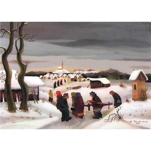 Slovenian [b. 1927] PEASANTS IN A VILLAGE WITH A HILLTOP CHURCH; 1980 oil on glass 19.75 x 27.5 in. (50.2 x 69.9 cm) signed & dated