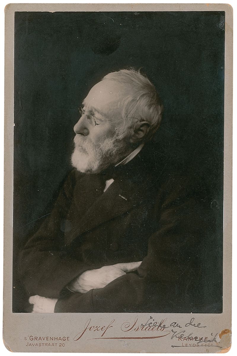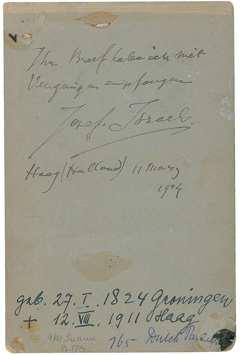 Prominent 19th-century Dutch painter (1824–1911). Original 4.25 x 6.5 cabinet photo by Gravenhage, signed on the reverse in black ink, “Jozef Israels, Haag (Holland) 11 Marz 1904,” adding a Dutch sentiment above his signature. In very good condition, with silvering and surface impressions to image, small ink notation to lower border, and mounting and adhesive remnants to reverse, as well as a couple ink notations to bottom.