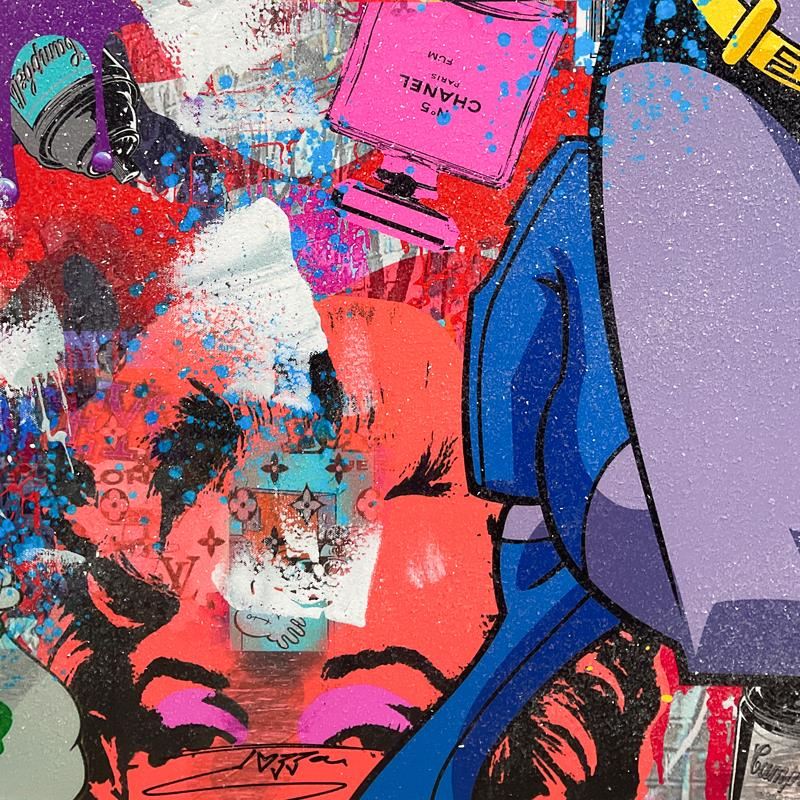 "Batman" is a unique mixed media acrylic embellished with glitter dust on gallery wrapped canvas by Jozza. Hand Signed by the artist and titled in verso, the piece comes with a letter of authenticity. Measures approximately 40" x 48" (image).
