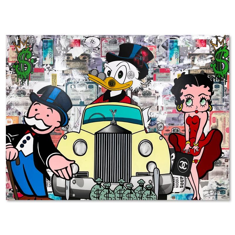 "Betty's new Friends" is a unique mixed media acrylic on gallery wrapped canvas by Jozza. Hand Signed by the artist and titled in verso, the piece comes with a letter of authenticity. Measures approximately 45" x 60" (image).