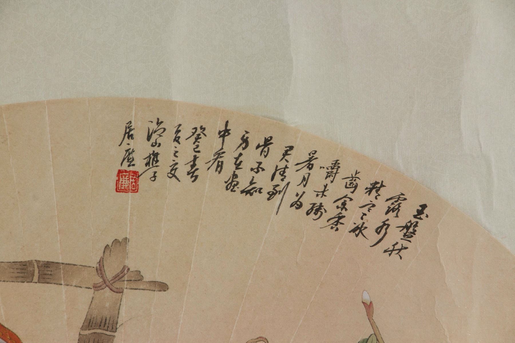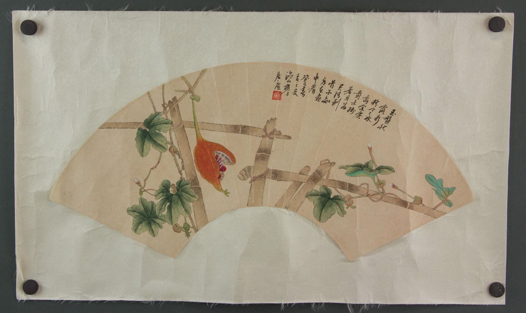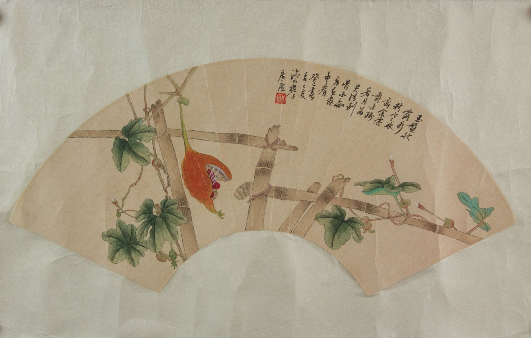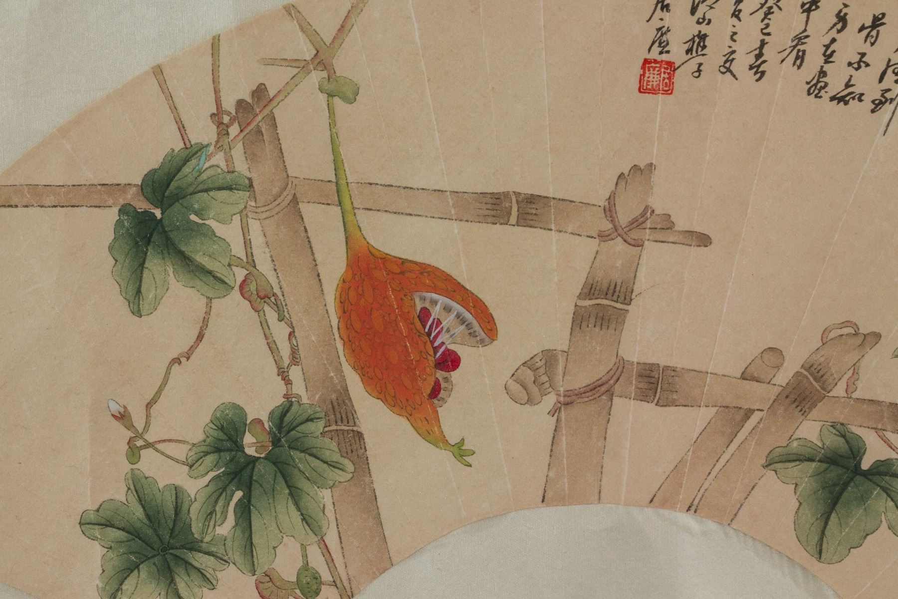 Painting of melon and rack; Chinese ink and watercolour on fan shape paper; mounted on paper roll; singed Ju Lian (1828-1904); inscribed with 1 artist seal; 53.5 cm x 27 cm