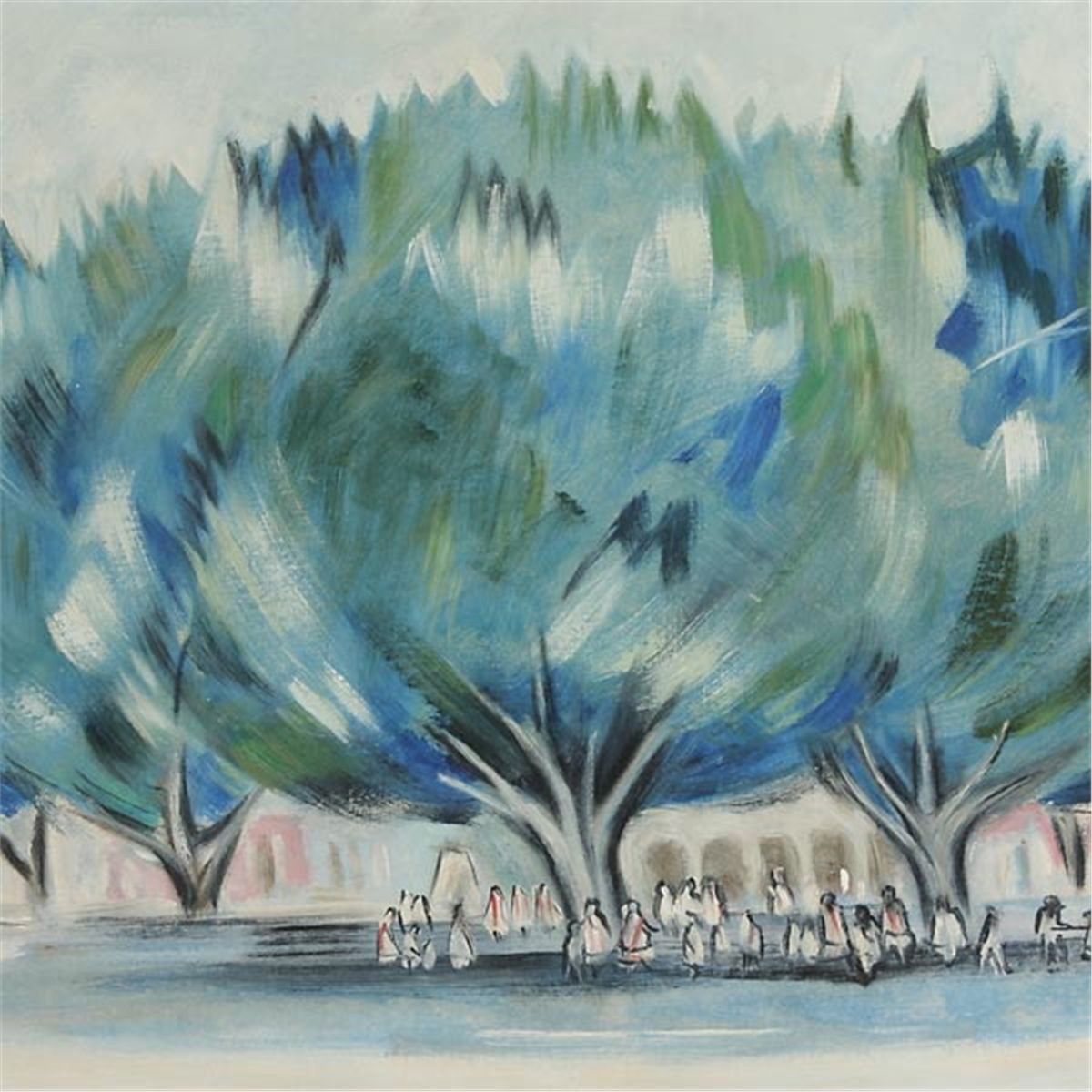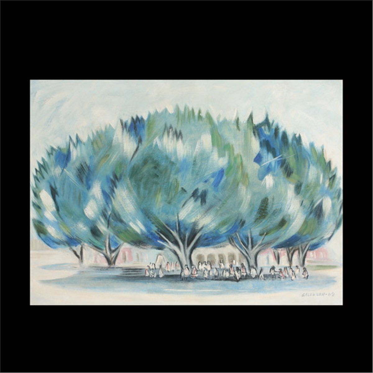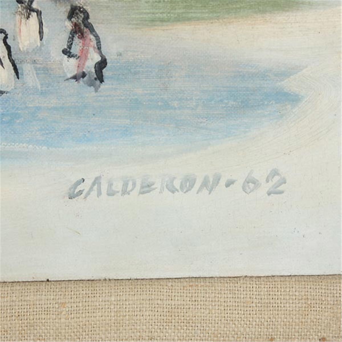 JUAN CALDERON (Mexican b.1938) Town Scene, 1962 Oil on canvas Sight: 21.25 x 29.50 inches/ 54 x 75 centimeters Signed and dated lower right "Calderon, 62" Frame: 25.50 x 33.50 inches/ 64.80 x 85 centimeters In good condition. Framed