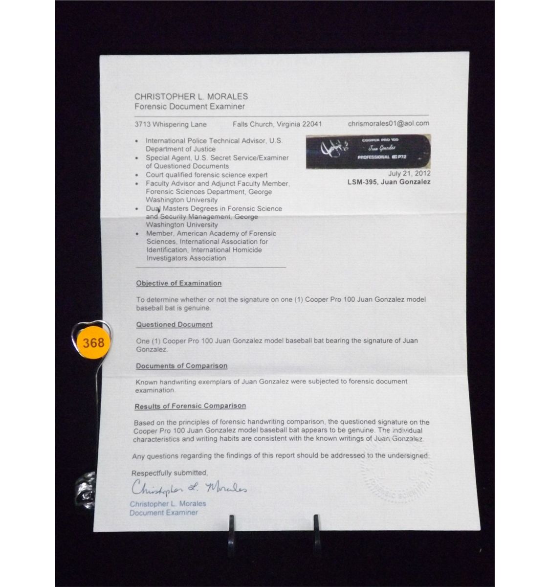 Juan Gonzalez Autographed Baseball Bat. Cooper Pro 100 Juan Gonzalez Model Bat. Appraised or estimated retail value $500. COA by Christopher Morales. All Sales Final. Please see terms and conditions of auction.
