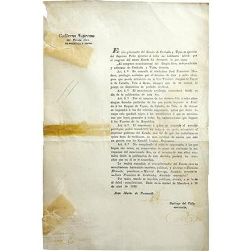 <B>Juan Martin de Veramendi Decree Signed</B></I> with his rubric, one page, 7.5" x 11.5". Monclava, April 16, 1833. Also signed with rubric by Santiago del Valle as secretary. First printing. Not in Streeter. Upon the death of Gov. Jose Maria Letona on September 18, 1832, Vice Governor Juan Martin de Veramendi assumed the office of governor of Coahuila and Texas. Del Valle served as president of the Congreso Constituyente of the state of Coahuila and Texas in 1825 and as counselor to the governor. By this document, Veramendi informs the people that the Congress has decreed that "<I>Citizen Jose Francisco Madero, is granted the exclusive right to introduce in the Trinity River, Steam, Power, Sail or Row Boats, for a period of eighteen years, if this can be performed at his expense.</B></I>" The decree also stated that the privilege would begin on the day the law was published, that there would be no special tax levied against Madero, and that he may transfer the right, all or in part, to anyone as long as that individual was not the subject of a nation at war with Mexico. Madero would lose his exclusive right if he did not navigate the Trinity River within three years from the date of this decree. The Trinity River flows 423 miles from the confluence of the Elm and West forks in present-day Dallas to the Gulf of Mexico. It is not clear why Madero received this privilege but it upset many Texians. The War Party cited it as one the reasons to separate Texas from Mexico. The enterprise never came to fruition as Madero died during a cholera epidemic five months later which also claimed the lives of Governor Veramendi and his daughter (Mrs. Jim Bowie) and the Bowie's two infant children. This document incorrectly identifies Veramendi as "<I>el vice gobernador</B></I>" even though he had succeeded Letona seven months earlier and decrees published since then called him "el gobernador." The upper left edge is mouse-eaten and there is light soiling on the right. There are tape stains in the wide blank left margin and light water stains and minor nicks at the right edge. The document, in apparent fine condition, is matted and framed to 15.5" x 27". <I>From the collection of Darrel Brown. </B></I><BR><BR><b>Shipping:</b> Framed - with Glass, Medium (<a target="_blank" href="http://www.heritageauctions.com/common/shipping.php">view shipping information</a>)